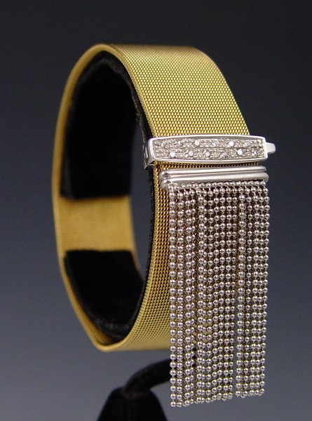 14K DIAMOND MESH BRACELET: 14K yellow with white gold bracelet with white gold dog chain tassels contains twelve round brilliant cut diamonds. Weight: .12 Ct. Approx. The diamonds average VS in clarity and G-H in color. The diamonds are bead set into a hinged clasp. Fine mesh bracelet measures approx. .75'' in width. Length: 7 1/2'' Weight: 40.6 grams.