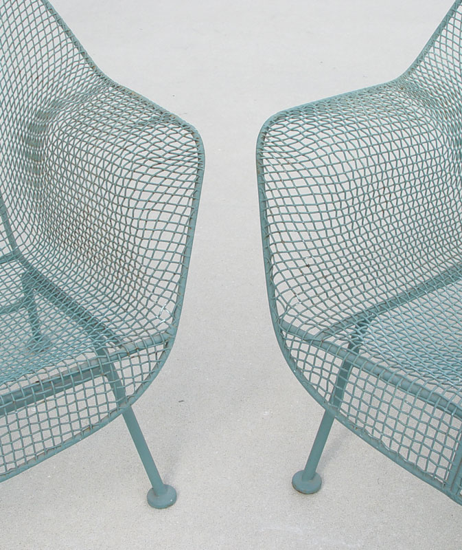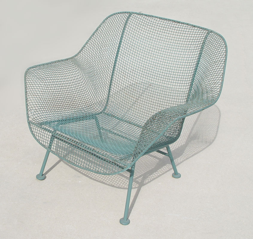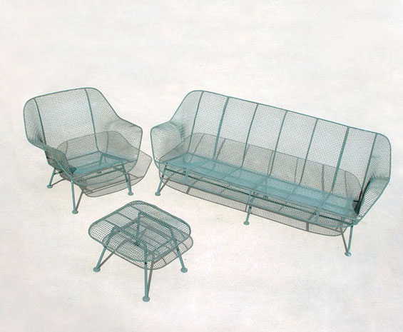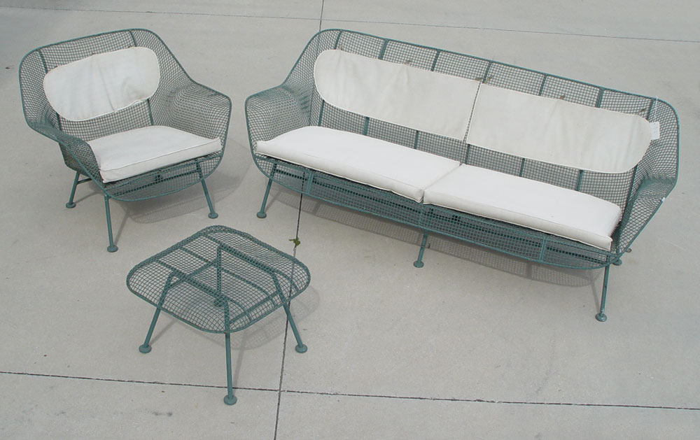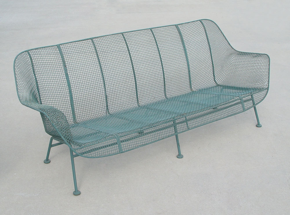 RUSSELL WOODARD MID CENTURY WIRE MESH SOFA, CHAIR AND OTTOMAN: From the Sculptura line, a full length sofa (approx. 70'' x 28'' x 28''), chair, and ottoman. Vintage painted finish with some rust showing.