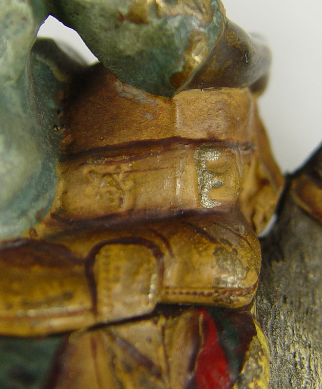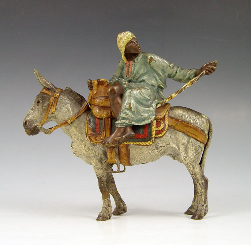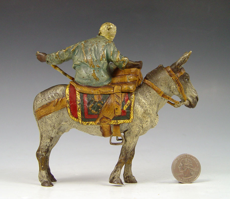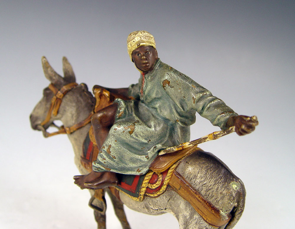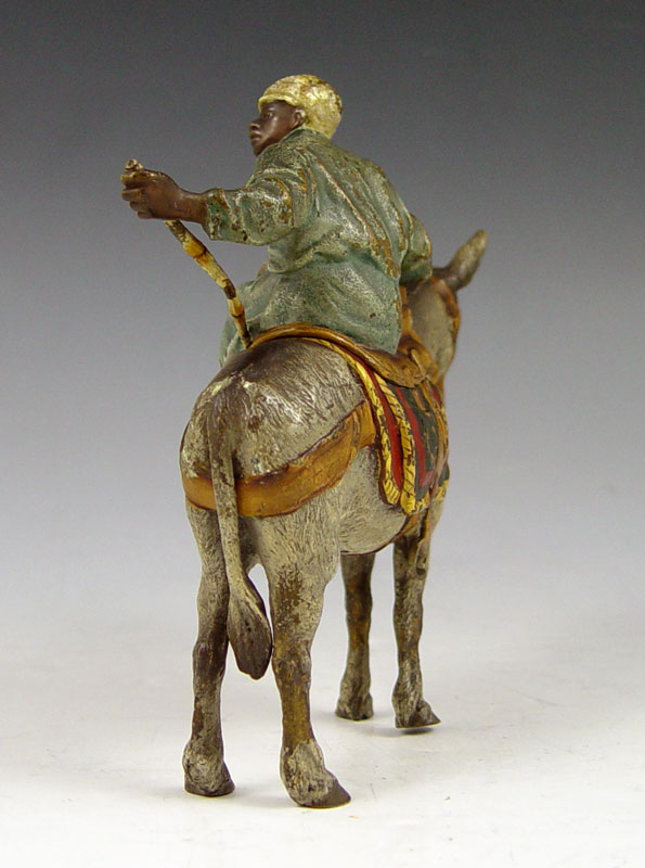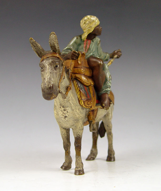 BERGMAN AUSTRIAN BRONZE ORIENTALIST FIGURE: Franz Xavier Bergman (1861-1936). Cold painted bronze figure of man with on a well dressed donkey. Impressed B in vase mark, 5 1/2''h. x 5 1/2'' l.