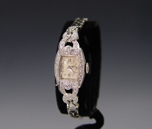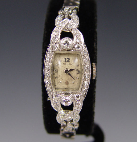 LADIES PLATINUM & DIAMOND WRISTWATCH BY HAMILTON: The watch case is platinum, the band and clasp are 14K white gold. Approx. 1 Ct total weight of round brilliant cut diamonds, VS in clarity and H-I color. Weight 22.8 grams.