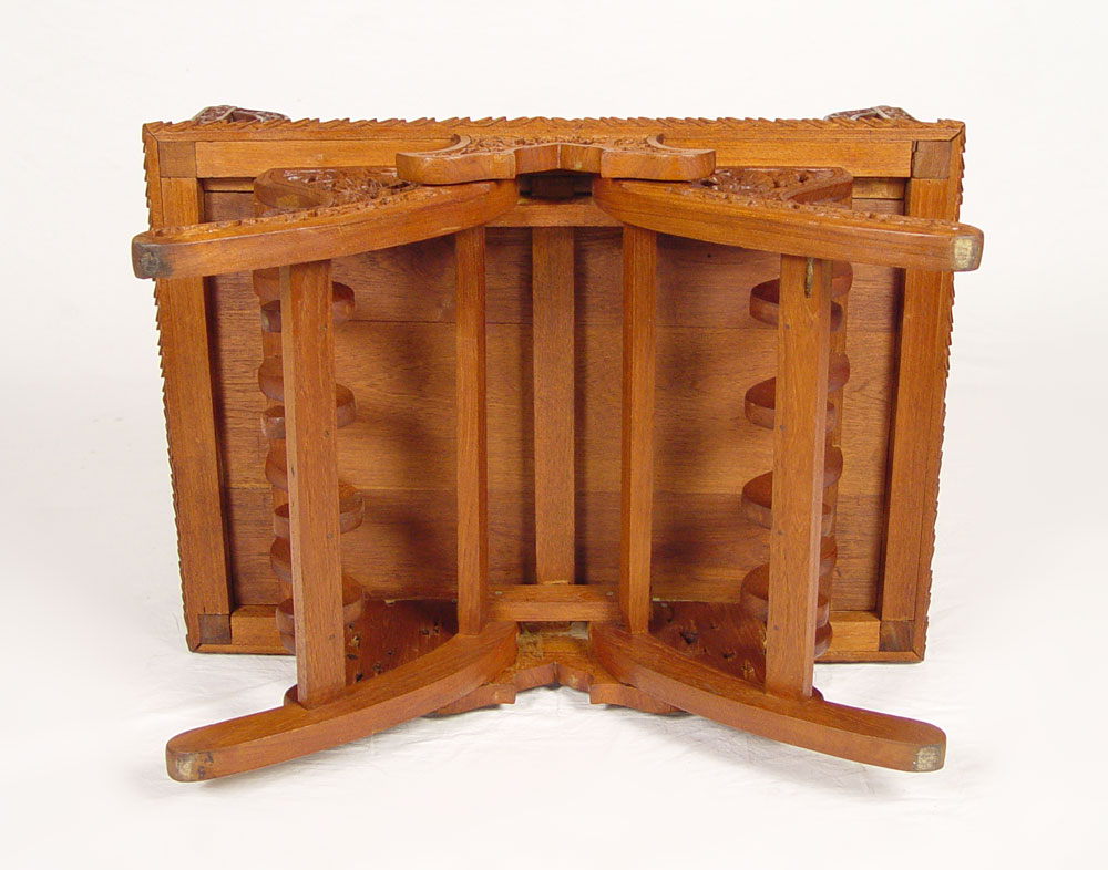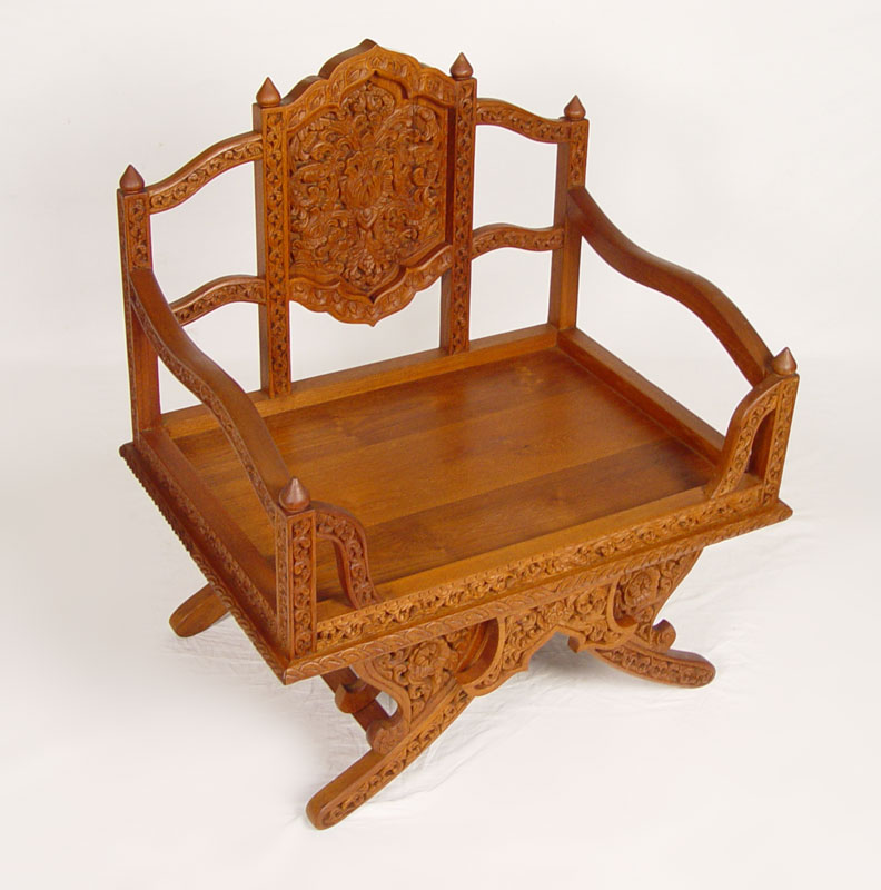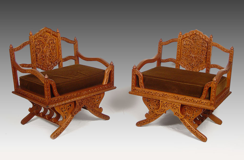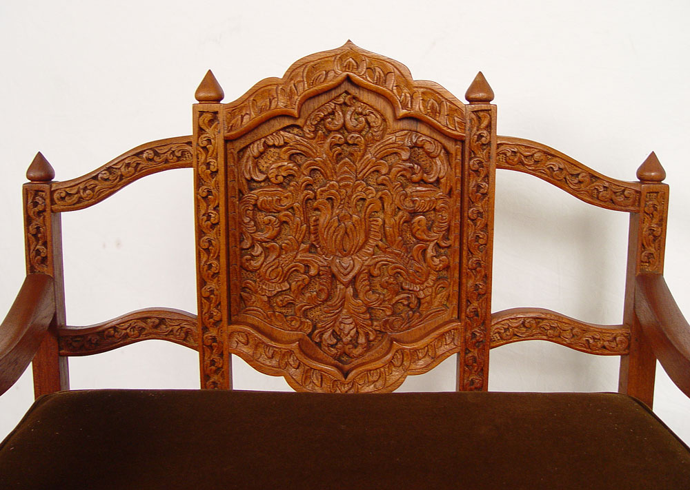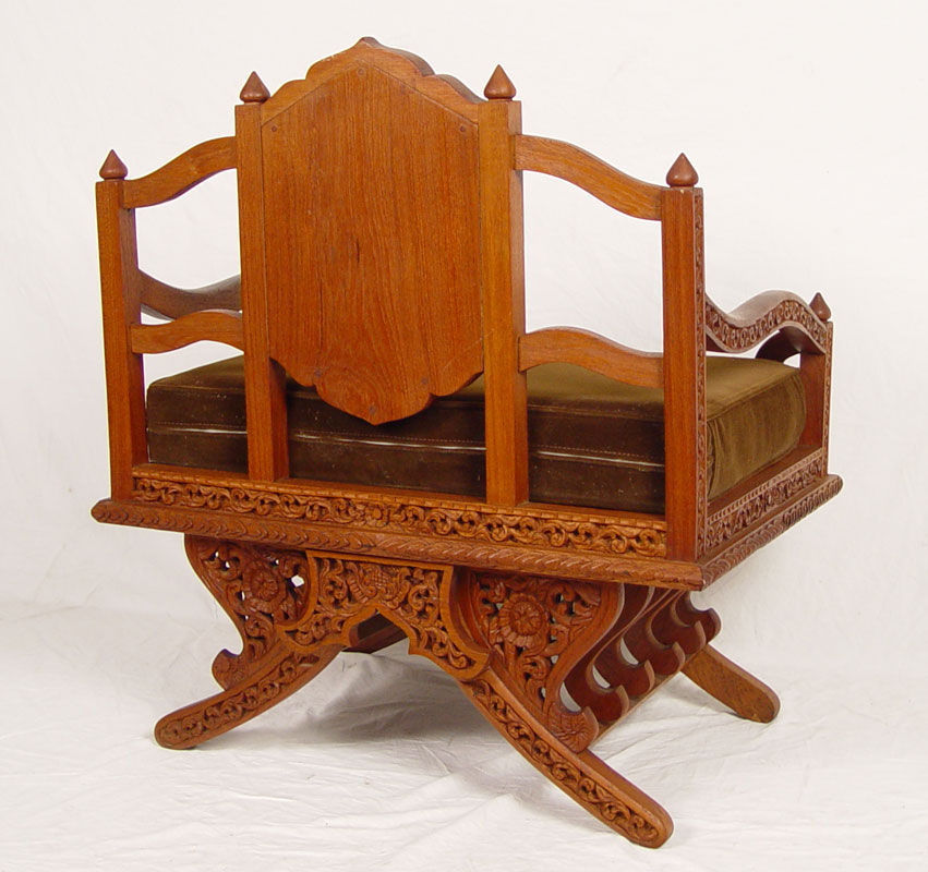 2 CARVED BALINESE ARM CHAIRS: Heavily relief and pierce carved, brown velvet seat cushions. 37 1/2'' x 34'' x 24 3/4''.