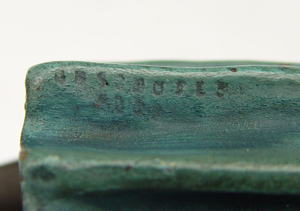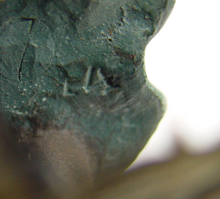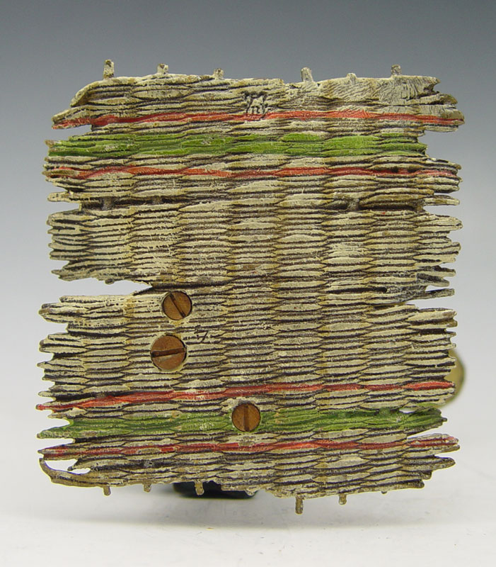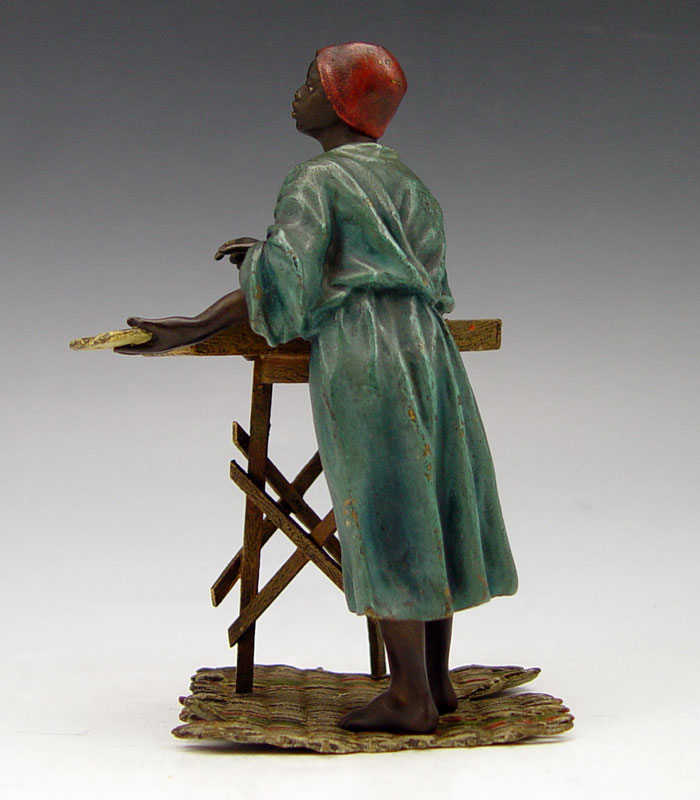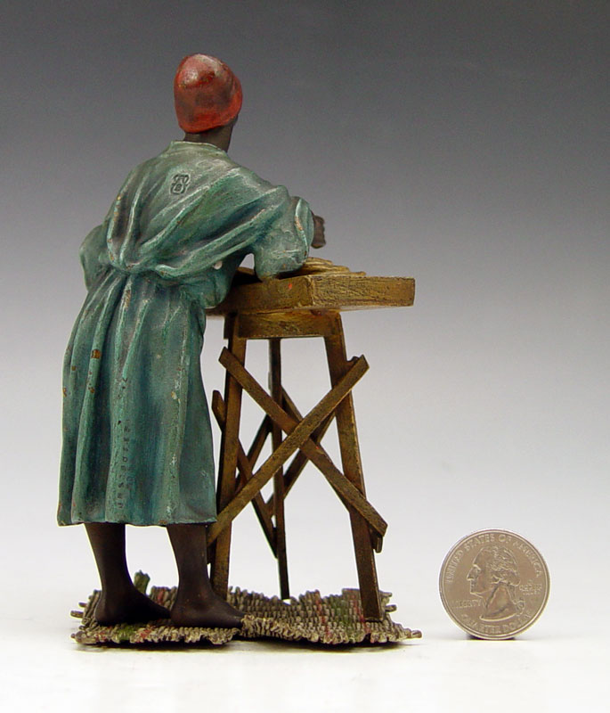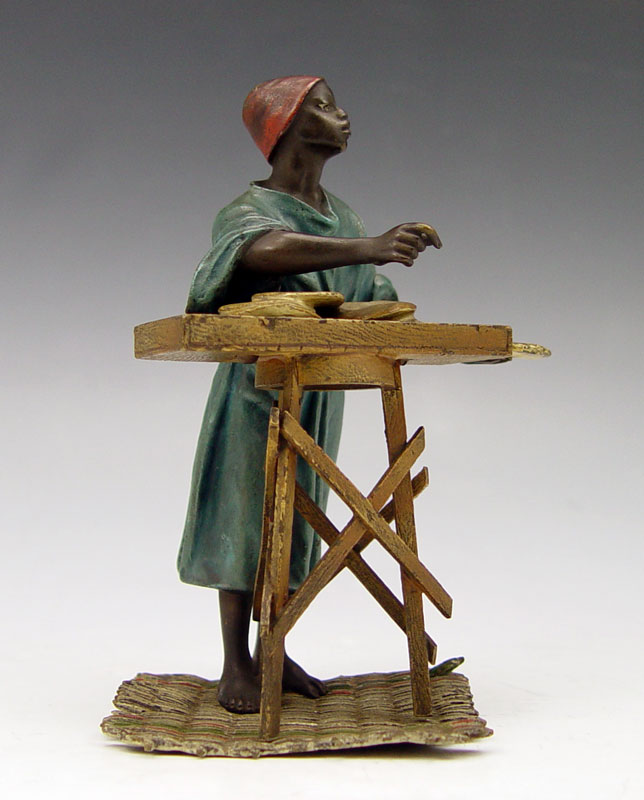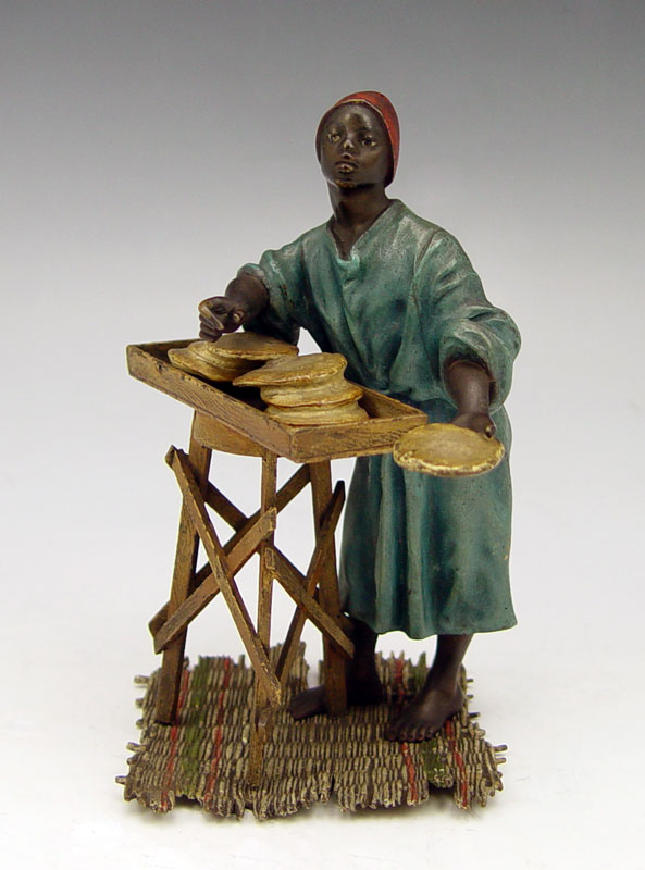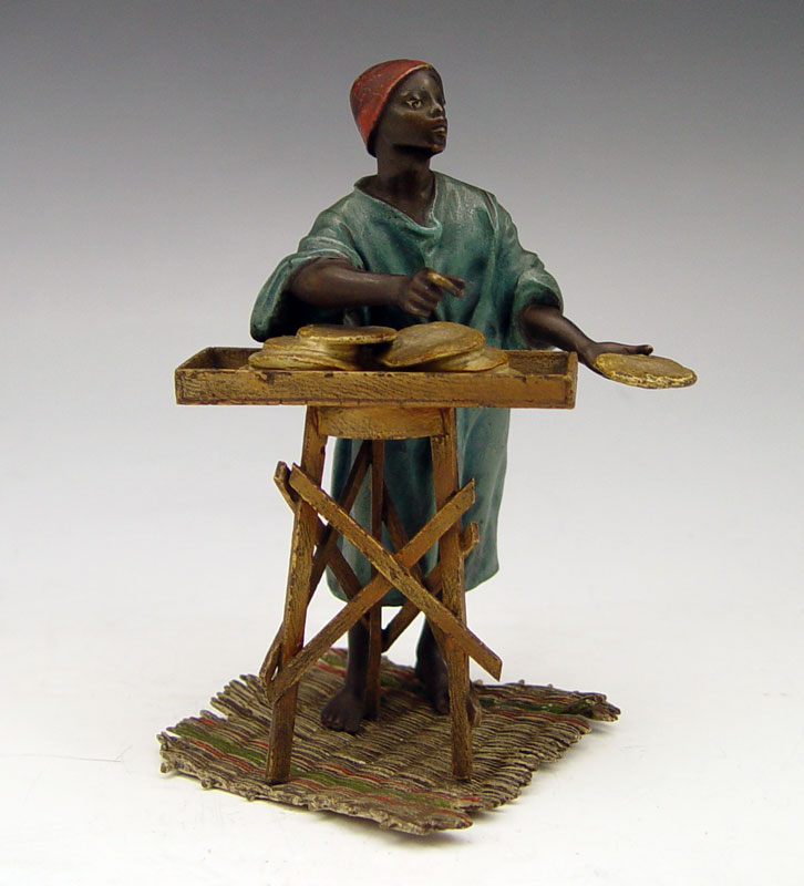 BERGMAN AUSTRIAN BRONZE ORIENTALIST FIGURE BREAD SELLER: Franz Xavier Bergman (1861-1936). Cold painted bronze figure of man standing on a woven mat, at his bread stand. Impressed B in vase mark, 5 1/4''h. x 3 1/2'' l.