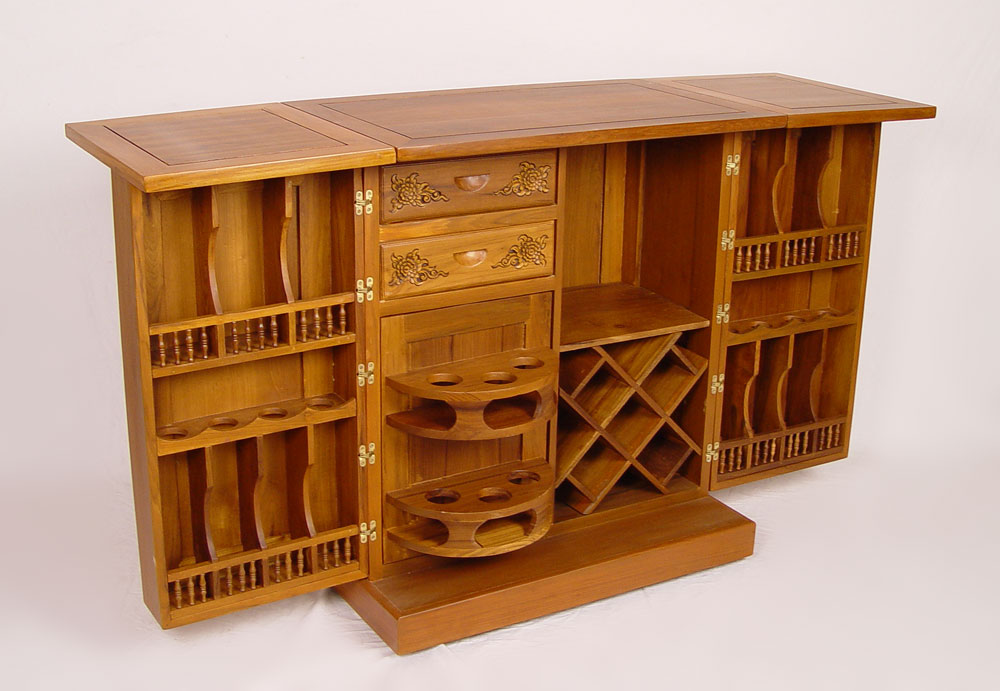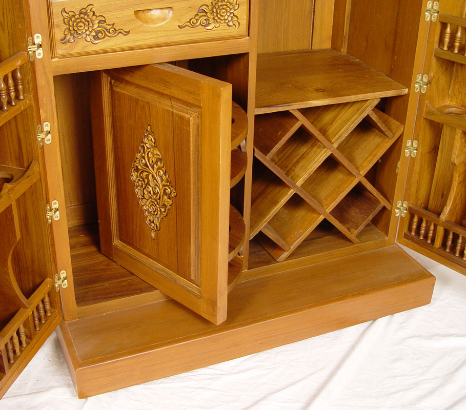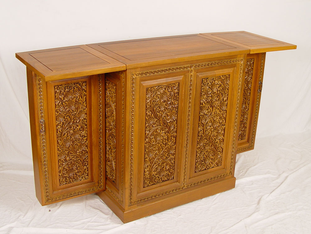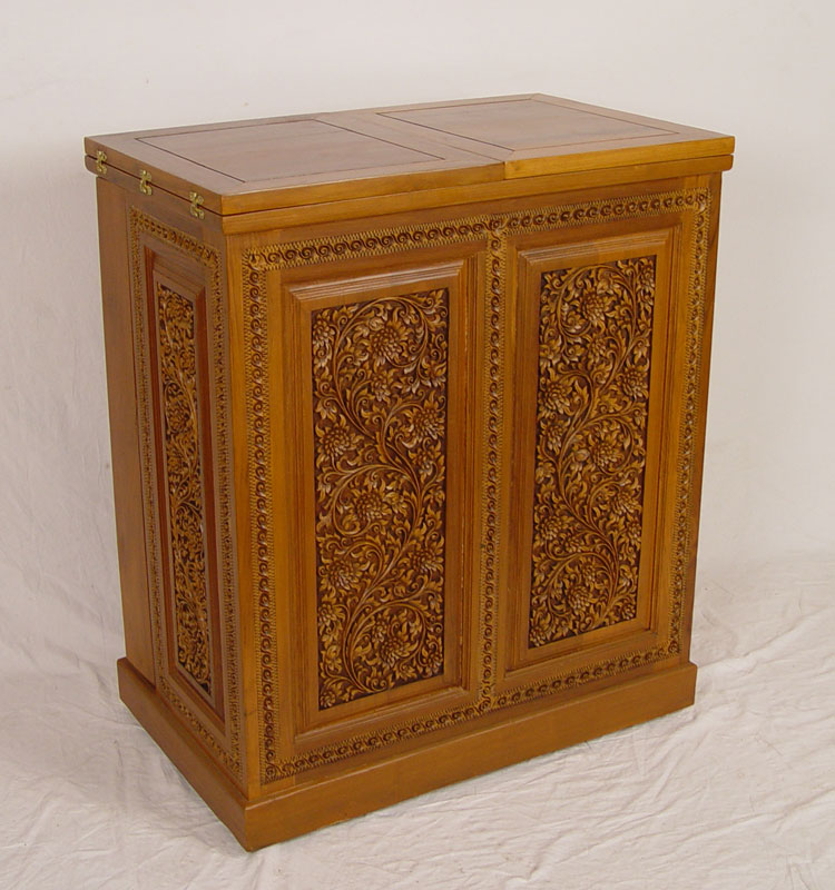 CARVED ROSEWOOD BAR: Complete bar fitted for bottles and accessories, 42 1/2'' h. x 36'' x 22''