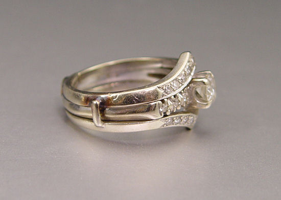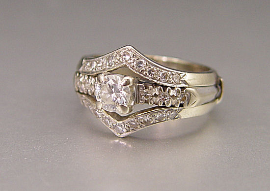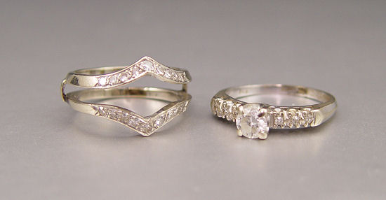 WHITE GOLD DIAMOND BRIDAL RINGS: 14K white gold bridal set with engagement ring having one round full cut diamond. Weight: .45 Ct. Approx. Rated VS in clarity J in color. An additional twenty four round single cut diamonds. Weight: .35 Ct. Approx. The diamonds average VS in clarity and H-I in color. The diamonds are prong set. Weight: 7.5 grams. Size: 8