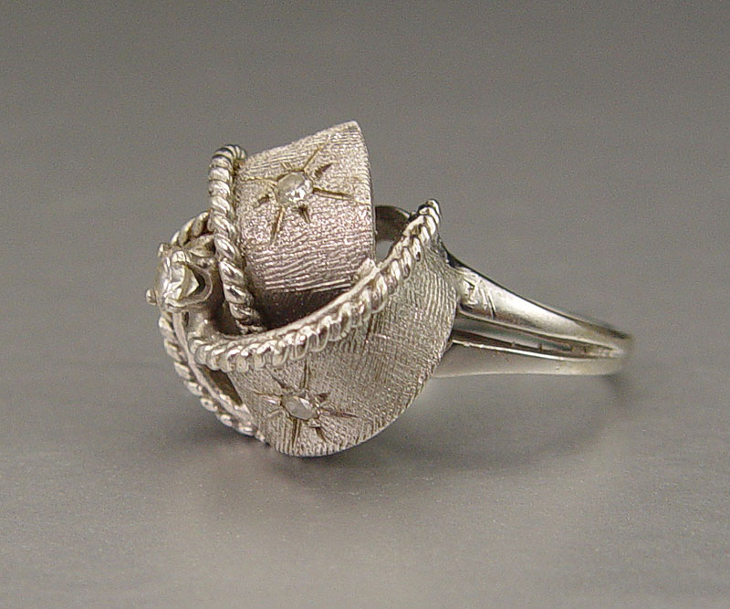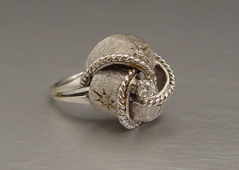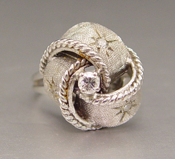 14k DIAMOND RIBBON OR KNOT RING: 14K white gold knot ring contains one round brilliant cut diamond. Weight: .12 t. Approx. The diamond is rated VS in clarity and G-H in color. The diamond is prong set. Weight: 7.5 grams. Size: 4