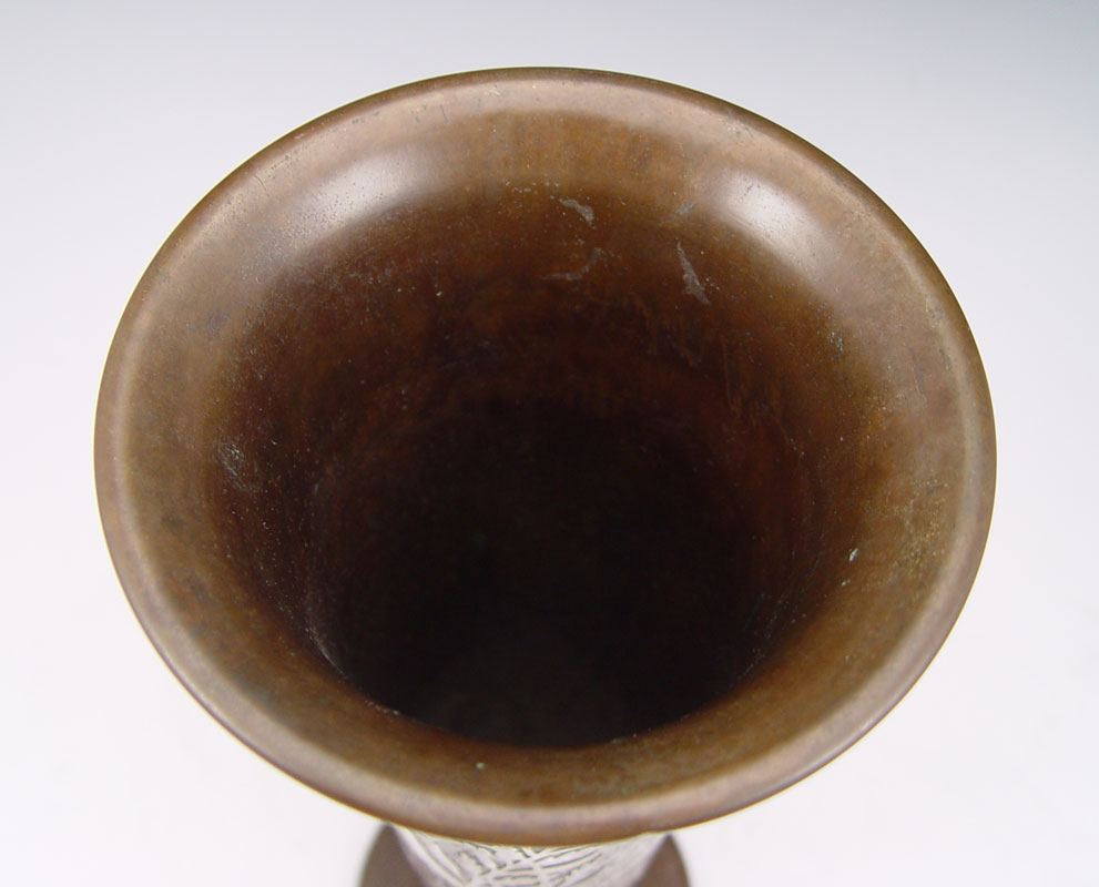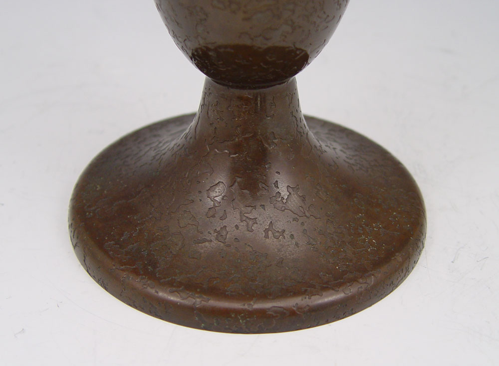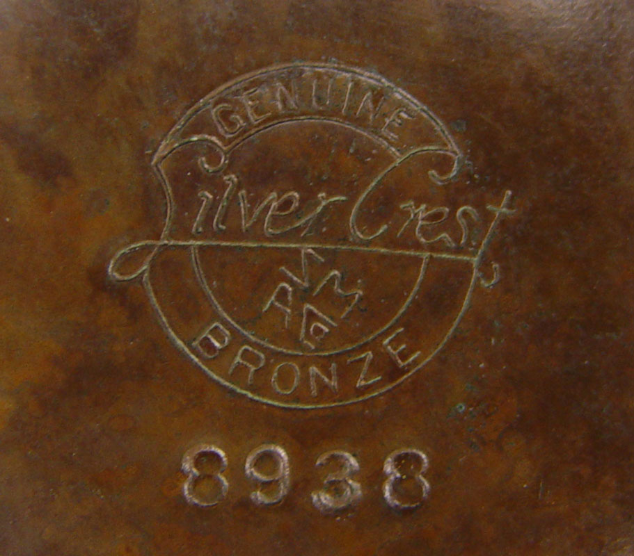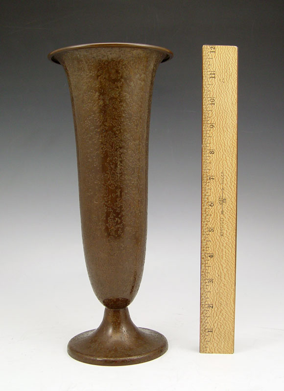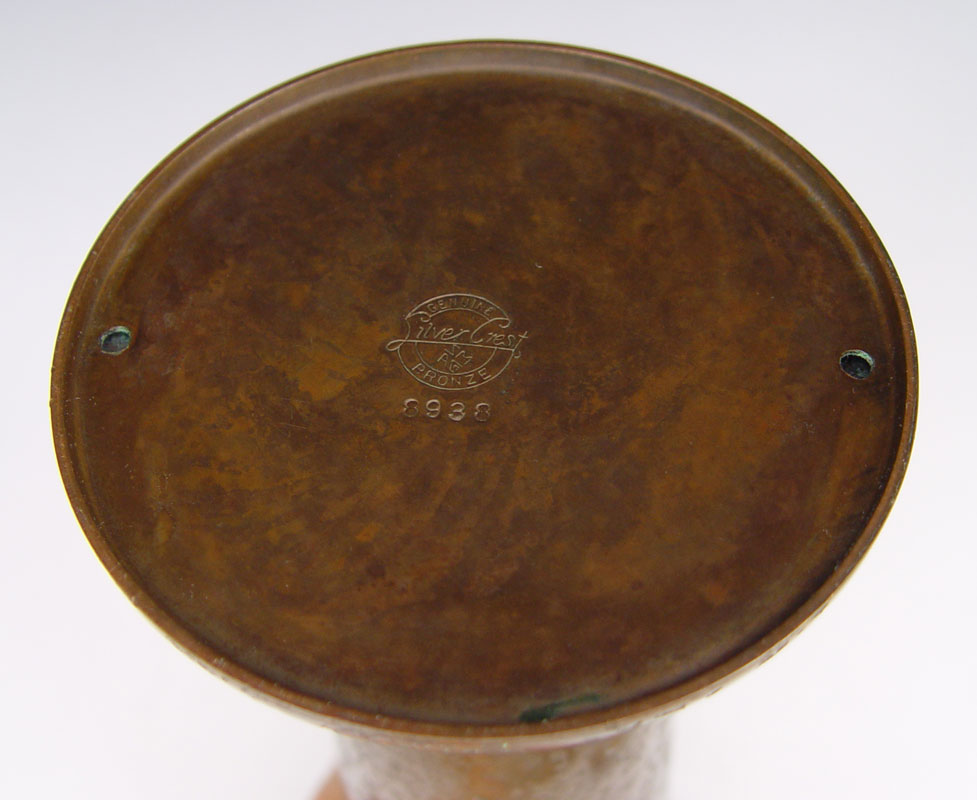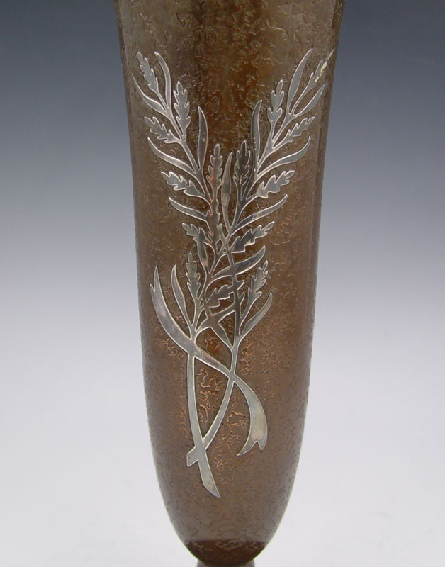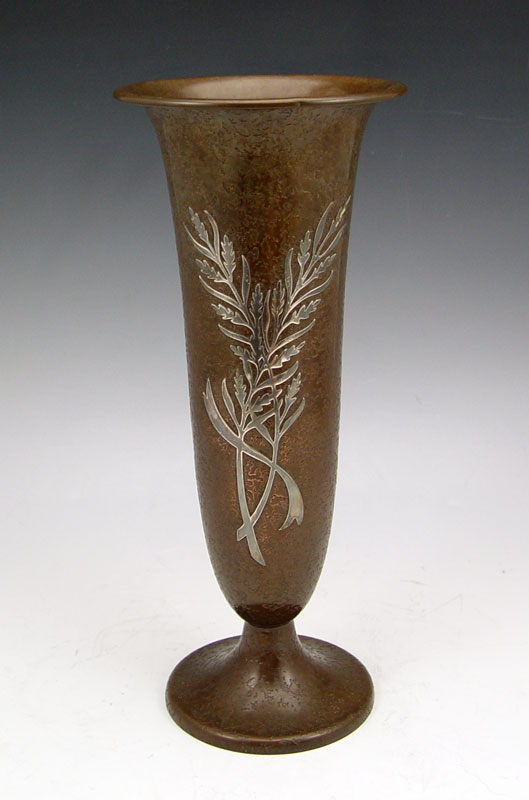 SILVER CREST SILVER OVER BRONZE VASE: Textured bronze with floral silver overlay. Impressed Silver Crest impressed mark and 8938. 12'' h. x 5''.
