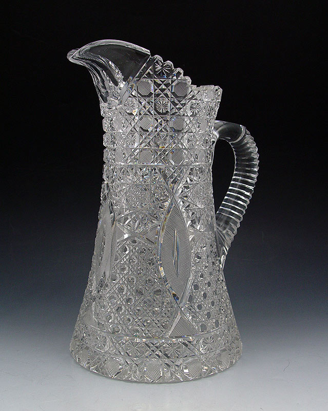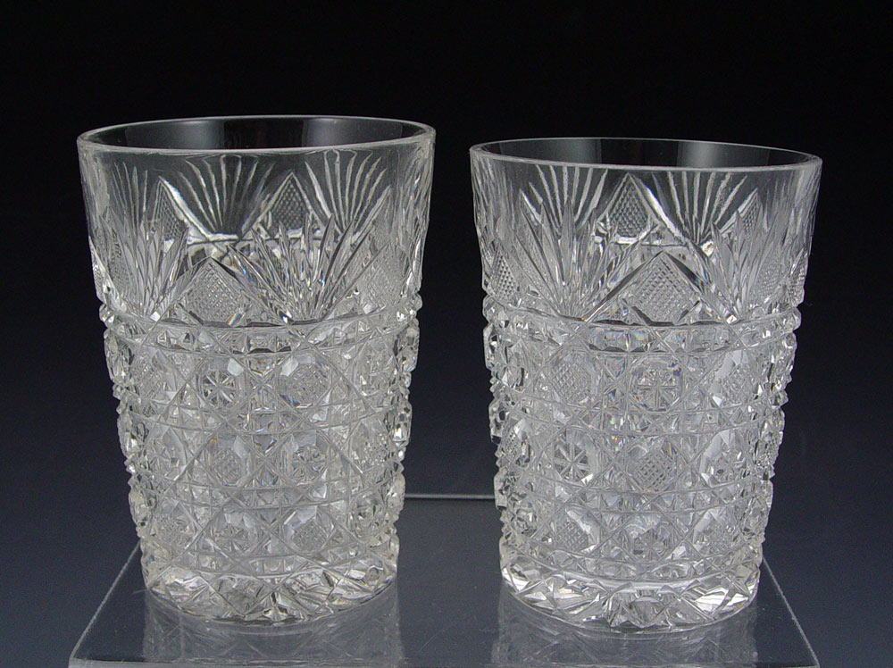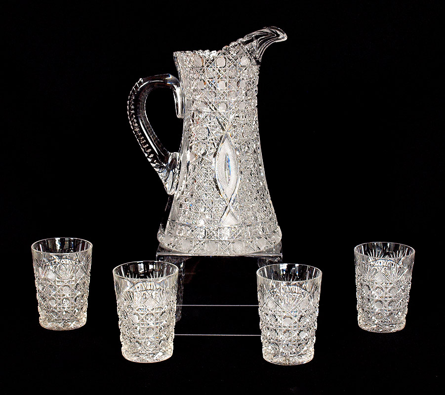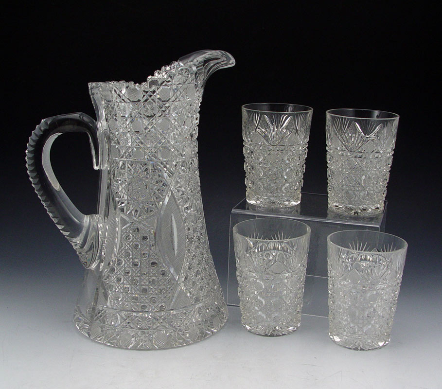 AMERICAN BRILLIANT PERIOD CUT GLASS PITCHER & 4 TUMBLERS: Excellent example of patterns, the pitcher 10 1/2''h., the tumblers 4'' more or less.