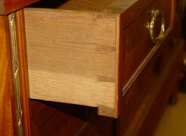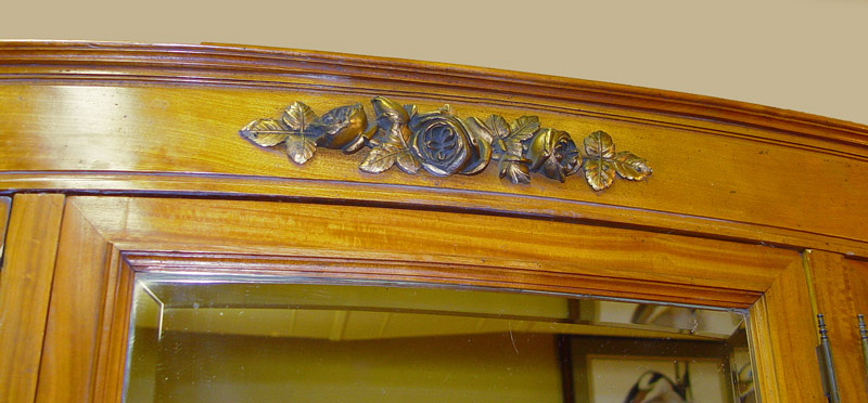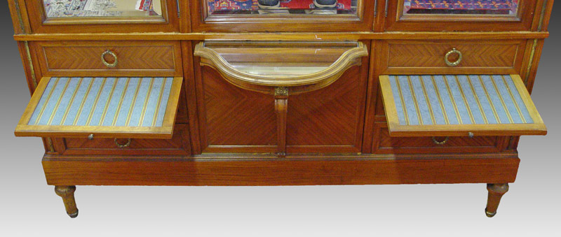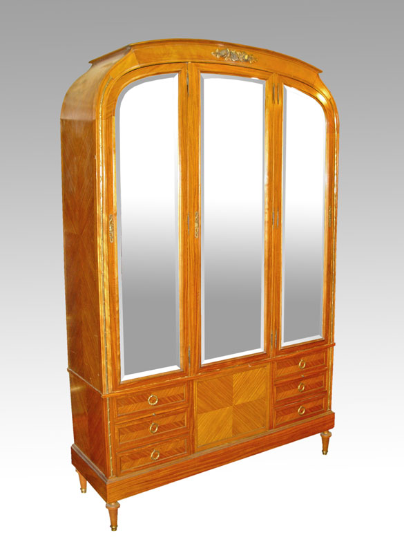 FRENCH MARQUETRY AND ORMOLU ARMOIRE: Great details include marquetry and ormolu mounts. Triple beveled mirror doors over 6 drawers and revolving center door with mirror shelf. 94 1/2'' h. x 60 1/2'' x 19 1/2''.