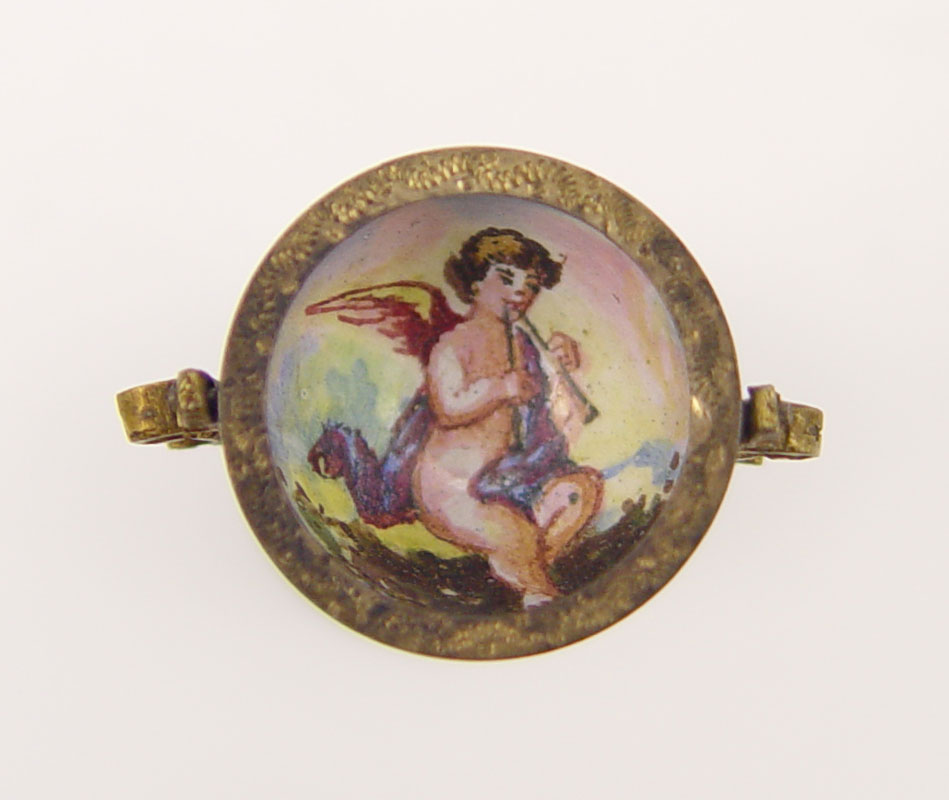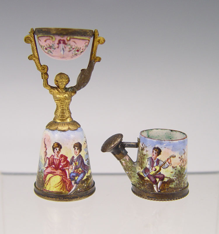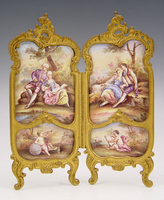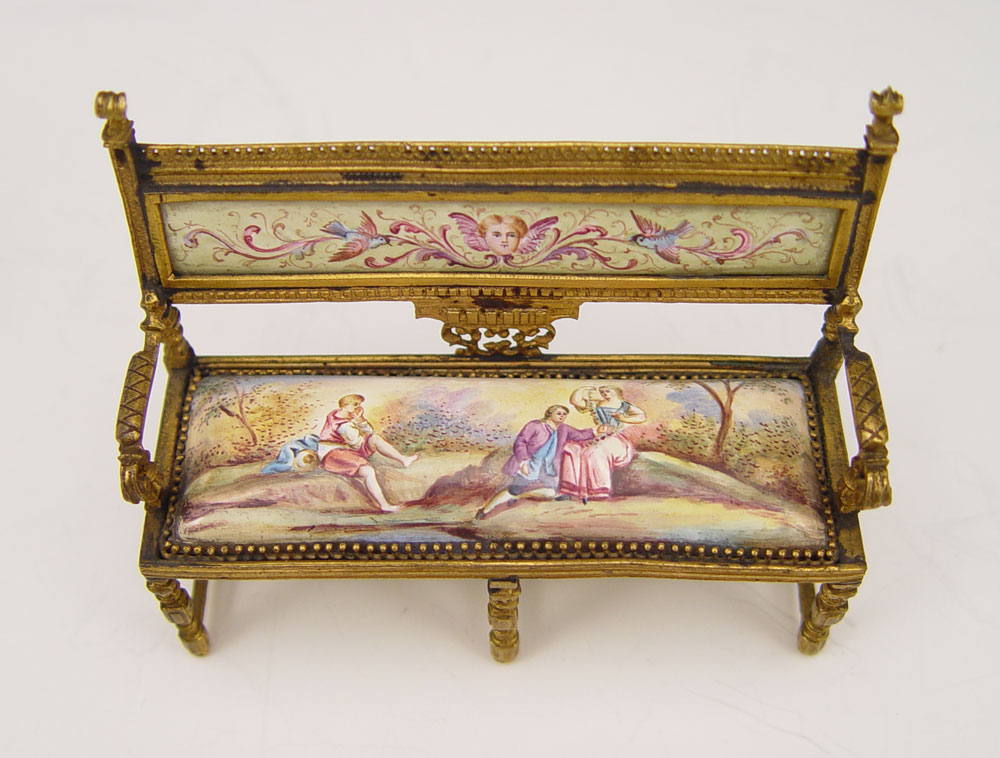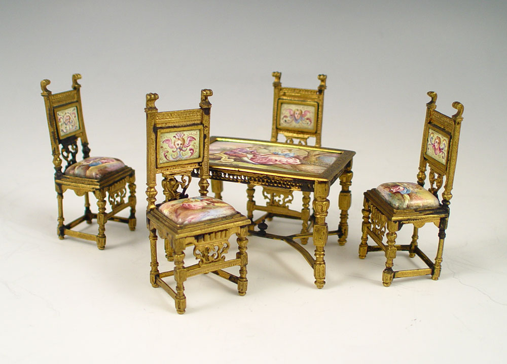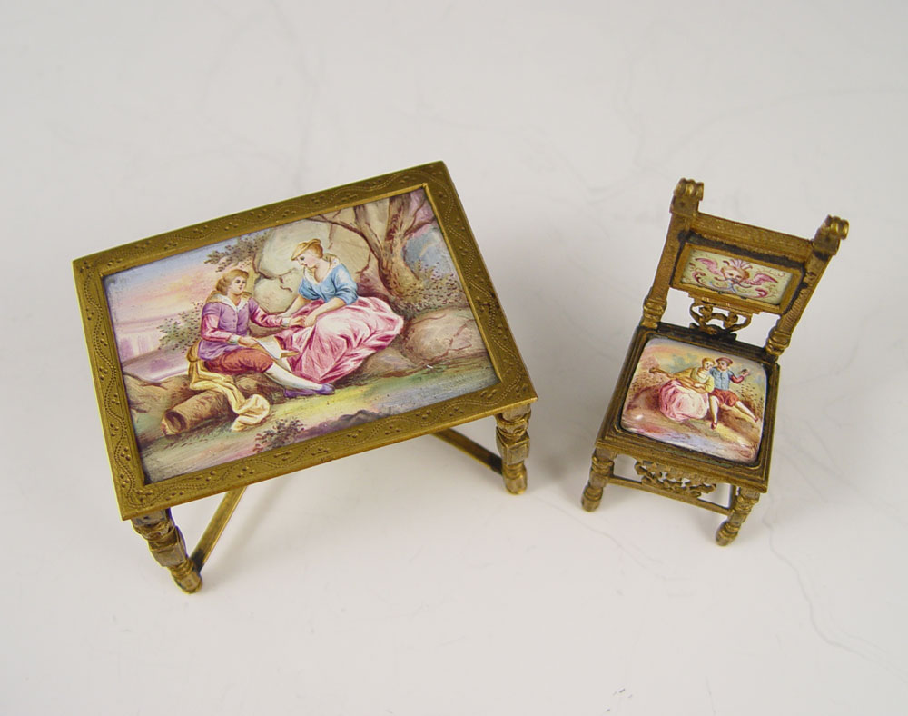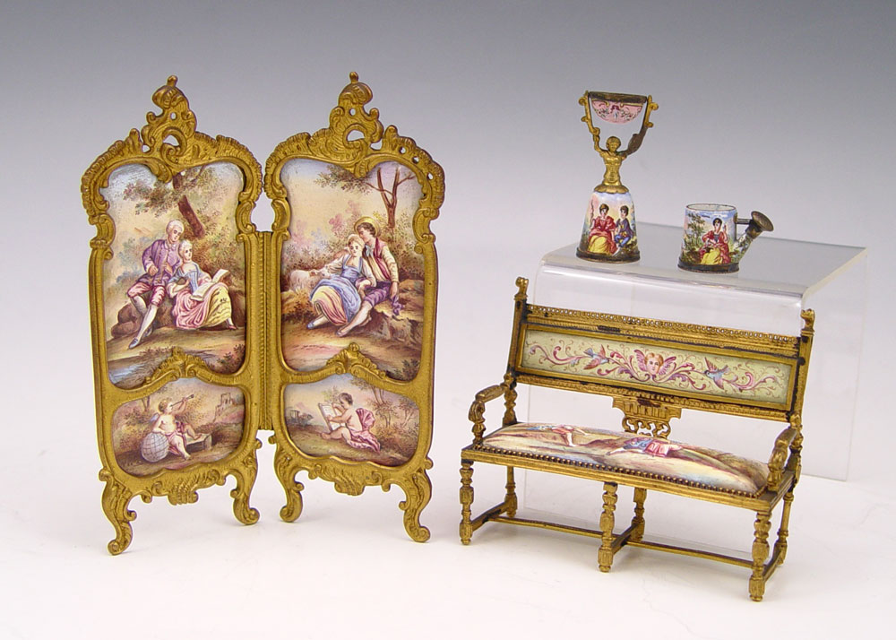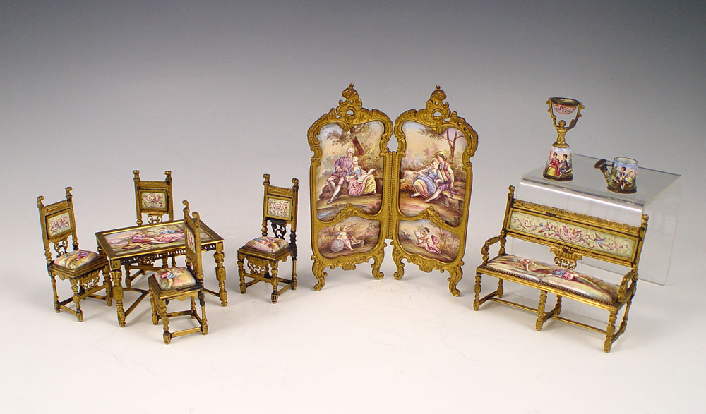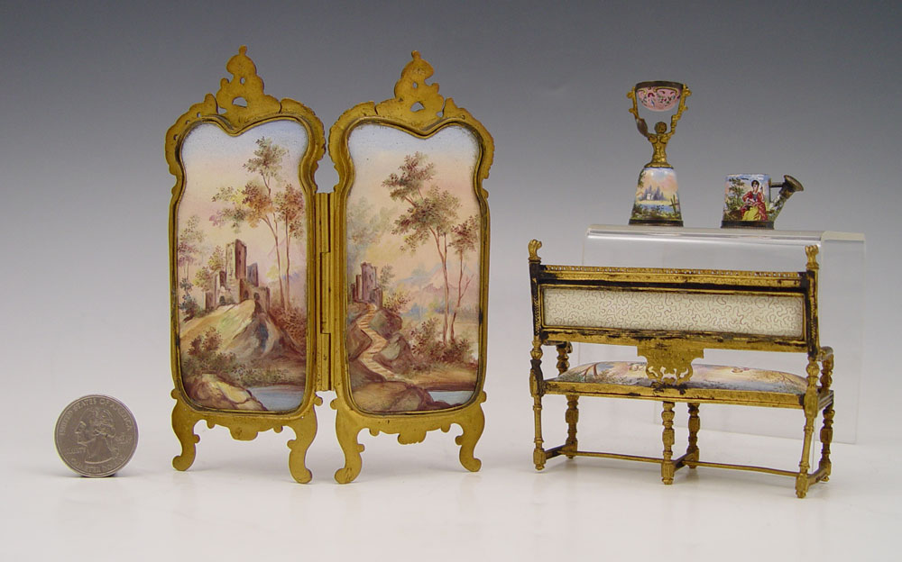 MINIATURE AUSTRIAN VIENNESE ENAMEL SALON SET: 7 pieces plus. The two panel hinged SCREEN (5''h. x 4'') with hand painted panels front and verso. SETTEE (2 1/2'' x 3 1/3''), 4 CHAIRS (2 3/4''), and TABLE (1 1/2'' tall). Accompanied by a 5/8'' tall water can and a 1 3/4'' loving cup.