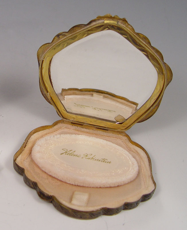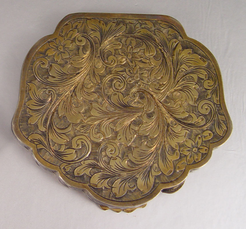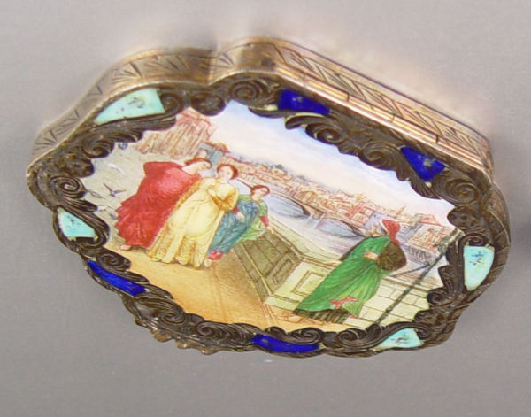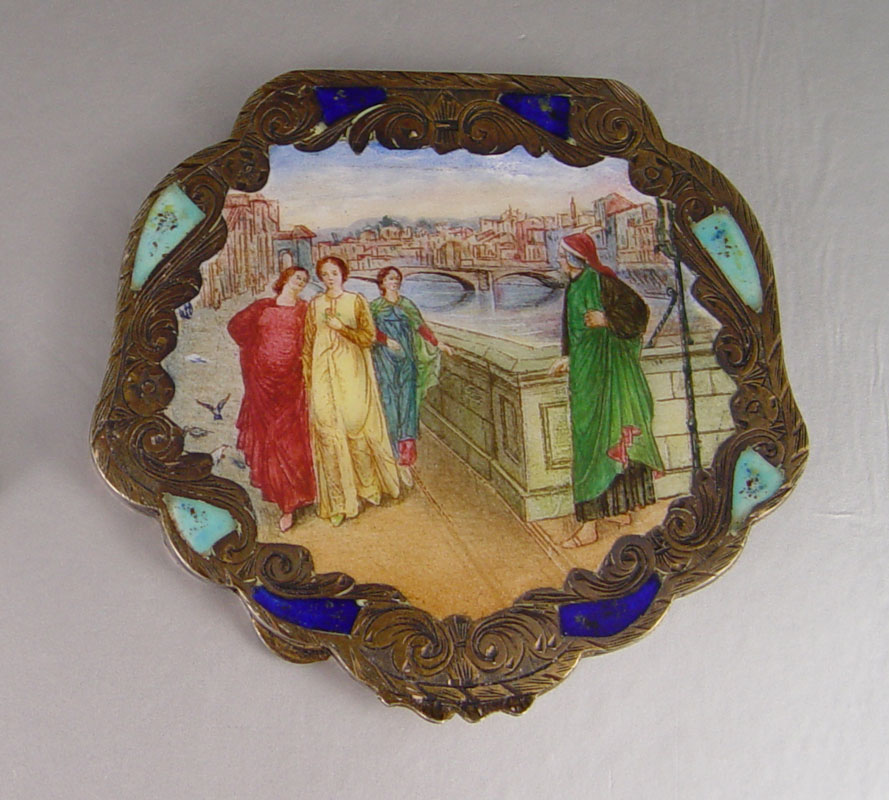 ENAMELED SILVER COMPACT: Vermeil 800 silver compact. Hinged top with enameled image of a gathering of figures on a bridge. Beveled mirror with small chip on the underside. 3 3/4'' x 3 1/2''.