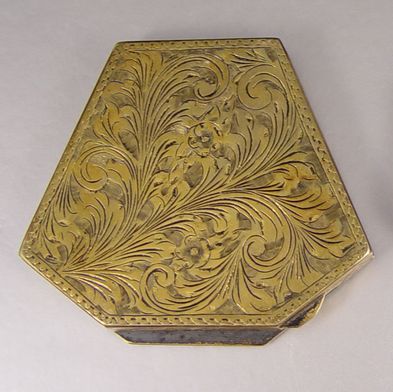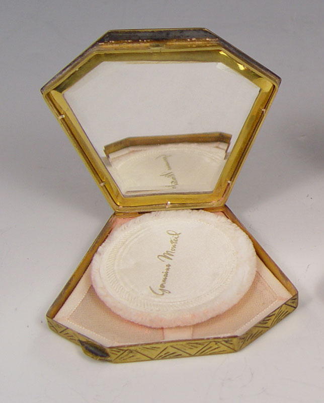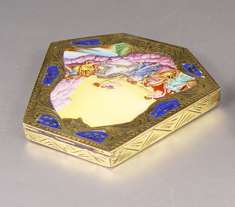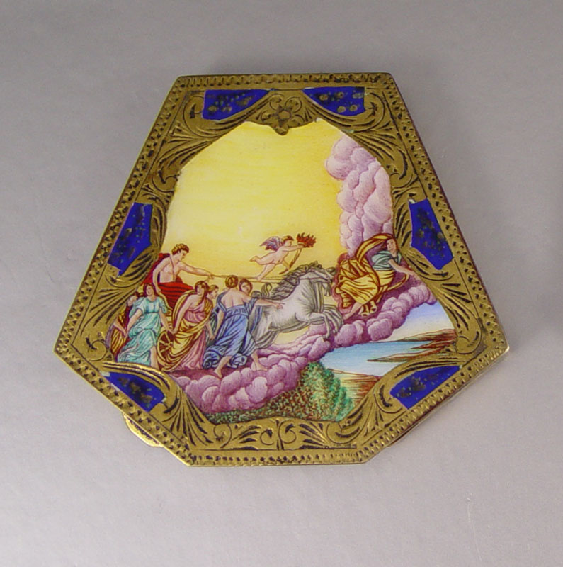 ENAMELED SILVER COMPACT: Vermeil 800 silver compact. Hinged top with enameled image of a chariot, rider, cupid and maidens. Beveled mirror. Stamped 800. 2 3/4'' x 3 1/4''.