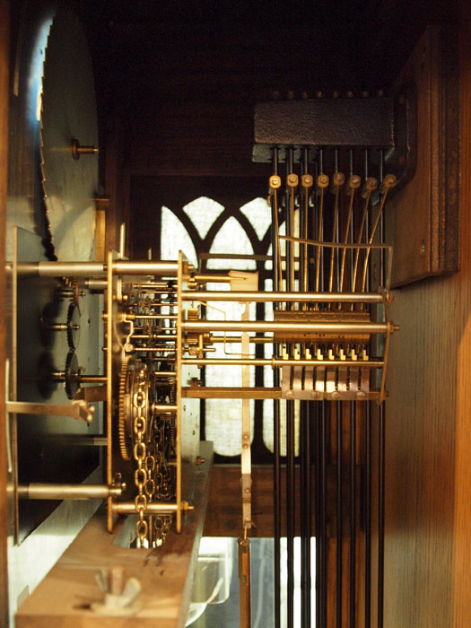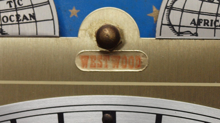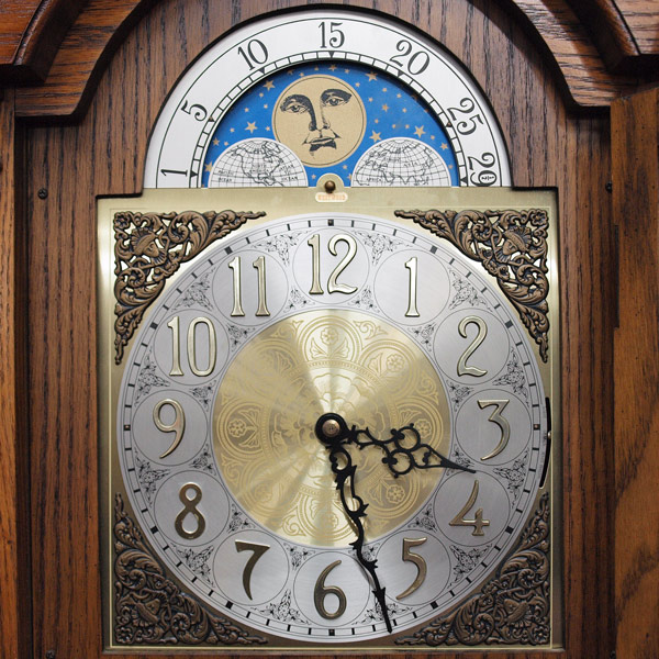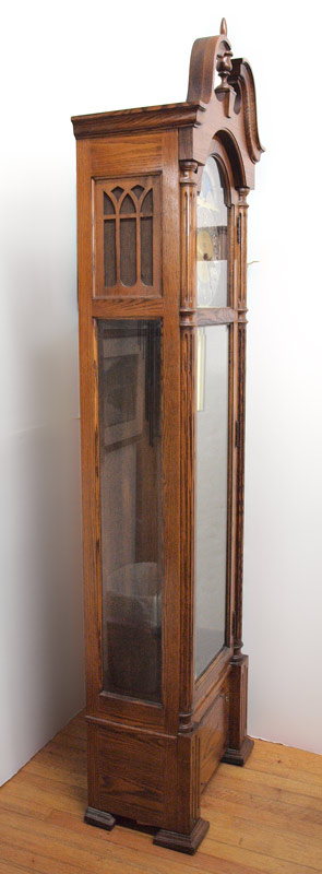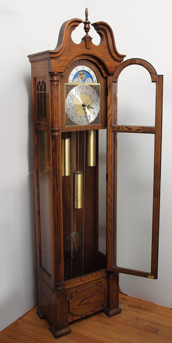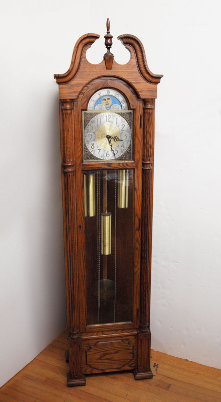 WESTWOOD OAK TALL CASE CLOCK: Oak case with half column fronts and broken arch pediment. Triple weight driven movement with 3 chimes and silent. Metal face with moon phase. 83'' h. x 21 1/2'' x 12 1/4''. Key in office.