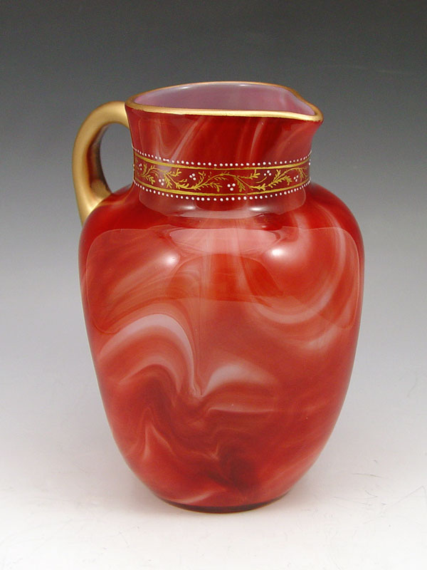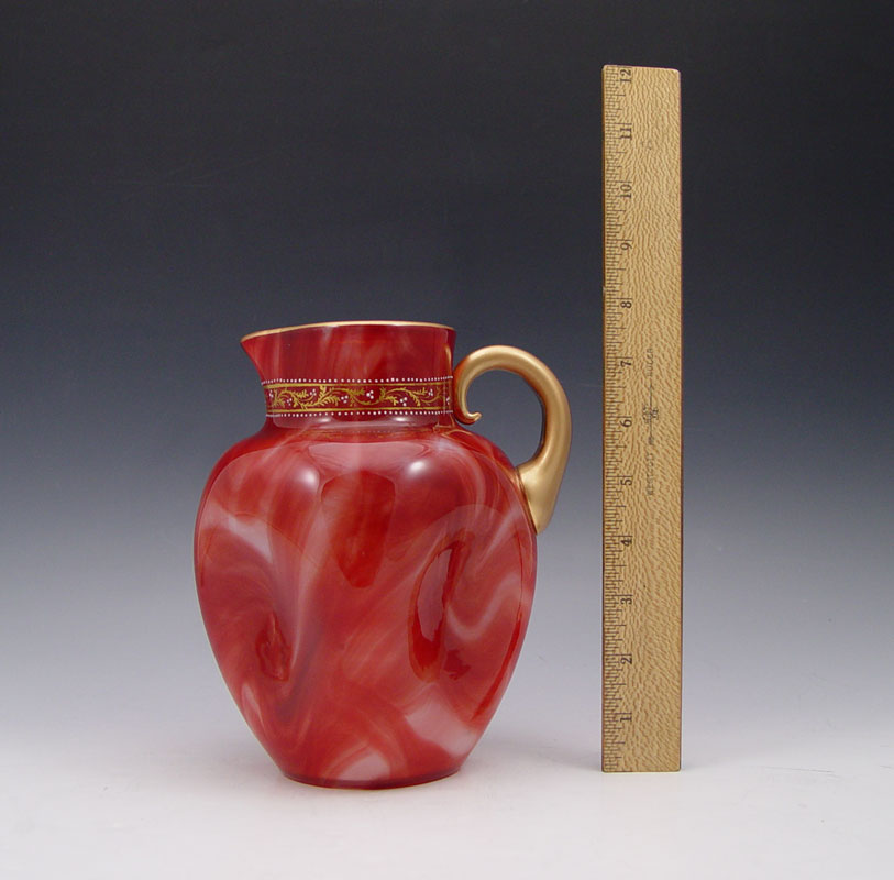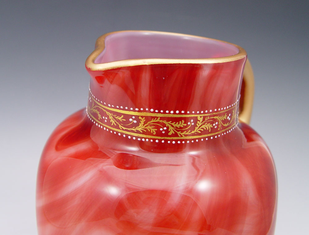 LOETZ MARMORIERTES ART GLASS PITCHER: Ca. 1885-1898. Karneol (red/pink) marbled glass with gilded highlights along the neck. 8'' tall.