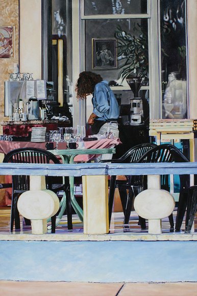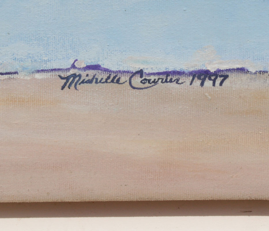 COURIER, Michelle, (American, 20th C.): South Beach, Acrylic/Canvas, 54'' x 36'', signed, unframed, label affixed verso.