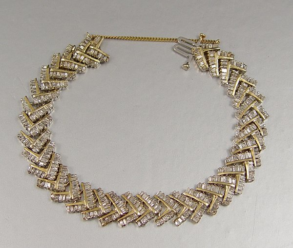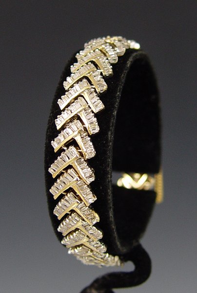DIAMOND CHEVRON LINK BRACELET: 14K yellow gold bracelet contains 408 baguette cut diamonds. Weight: 6.00 Ct. Approx. The diamonds average I1 in clarity and I-J-K in color. The diamonds are channel and prong set. Weight: 26.5 grams. Length: 7''.