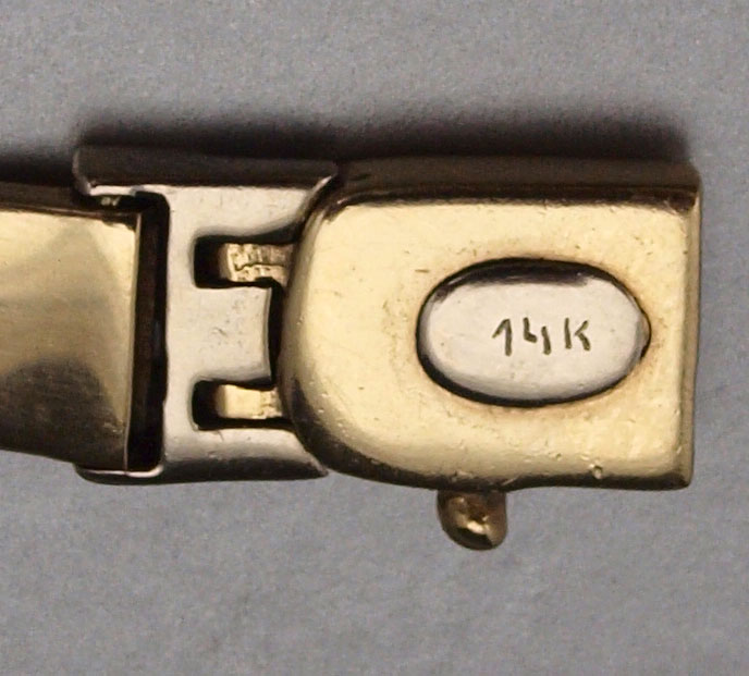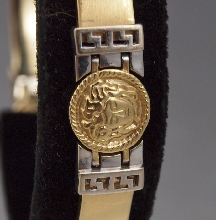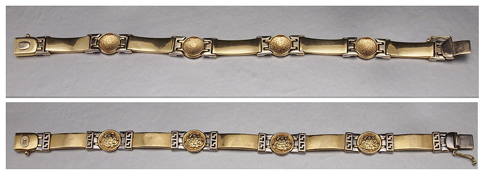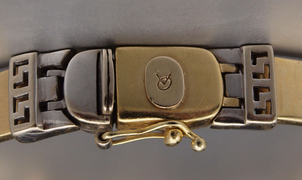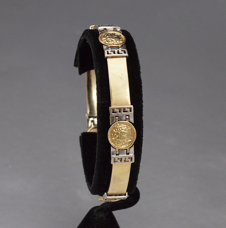 VERSACE TWO TONE GOLD BRACELET: 14K yellow gold bars and logo links accented with white gold Greek keys. Approx. 26.6 grams. 8 1/2''l.