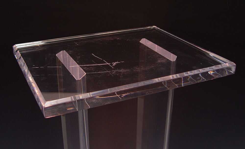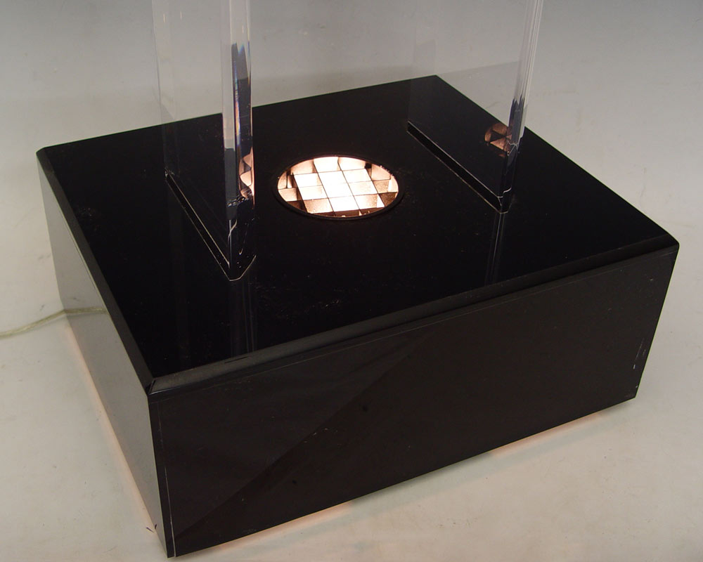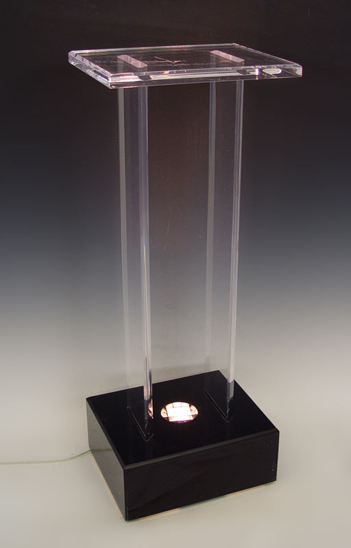 ACRYLIC 2 COLUMN PEDESTAL: Upward illumination from the base. 39'' tall, the top is 12'' x 15''.
