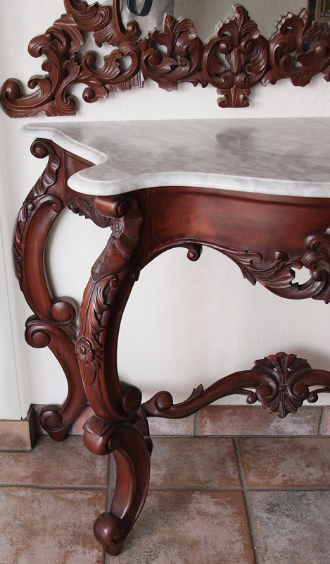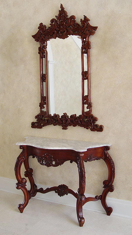 CARVED MAHOGANY MARBLE TOP HALL TABLE & MIRROR: Table is approx 31'' tall x 42 1/4'' x 17 1/4'' and mirror is 53 1/2'' tall x 35 1/2'' w.