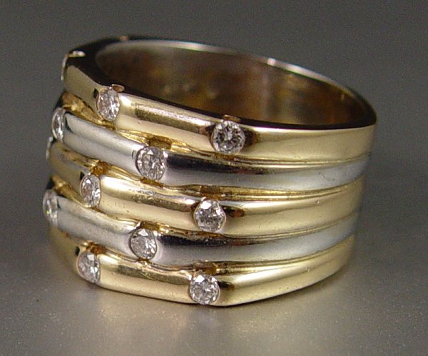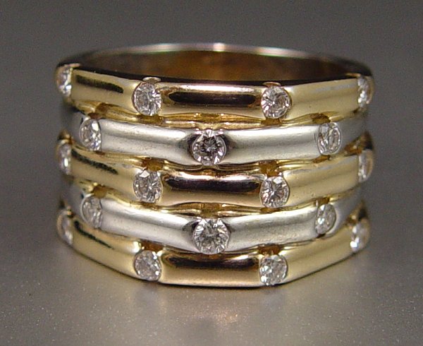 A WIDE TWO TONE 14K DIAMOND BAND: Alternating rows of 14K white and yellow gold, containing eighteen round brilliant cut diamonds. Weight: .60 Ct. Approx. The diamonds average VS in clarity and G-H in color. The diamonds are channel set. Weight: 14.3 grams. Size: 8