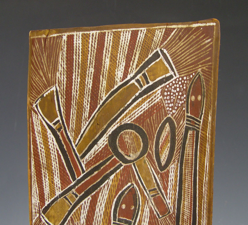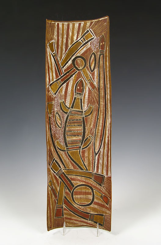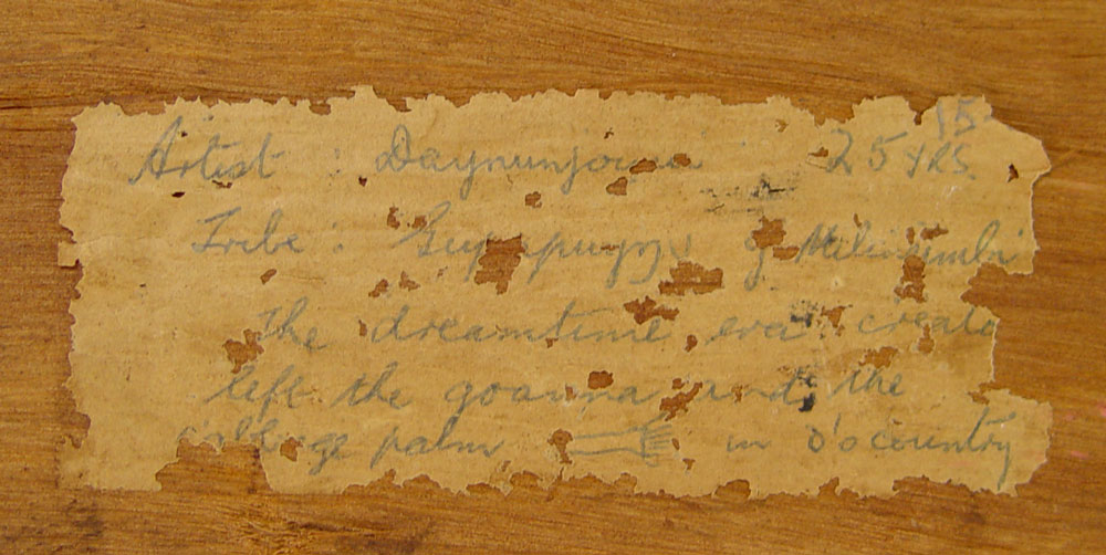 AUSTRALIAN ABORIGINAL BARK PAINTING OF GOANNA: Titled on label verso ''The dreamtime era creator left the goanna and the cabbage palm in O'O country''. Partial artist name on label Daynunjou?? 25 years and partial tribe name Gug??gugzy? g. Malismbi?. Measures 22 3/4'' x 7'' x 2''.