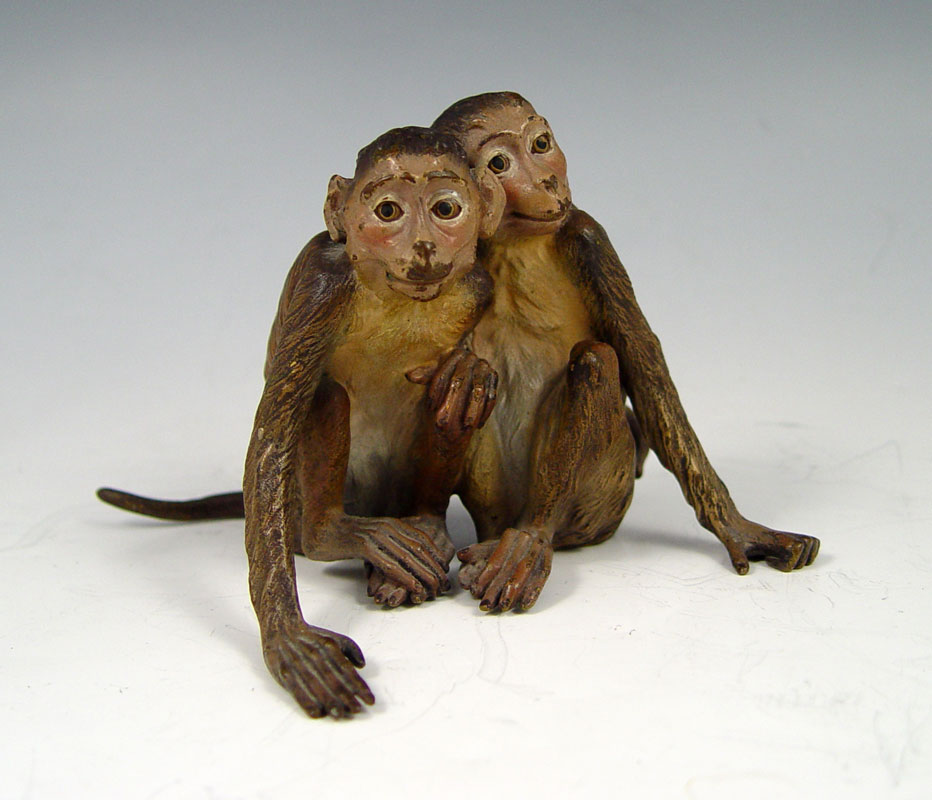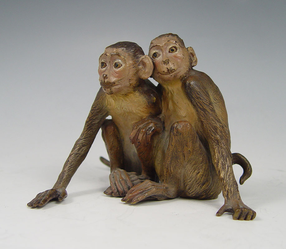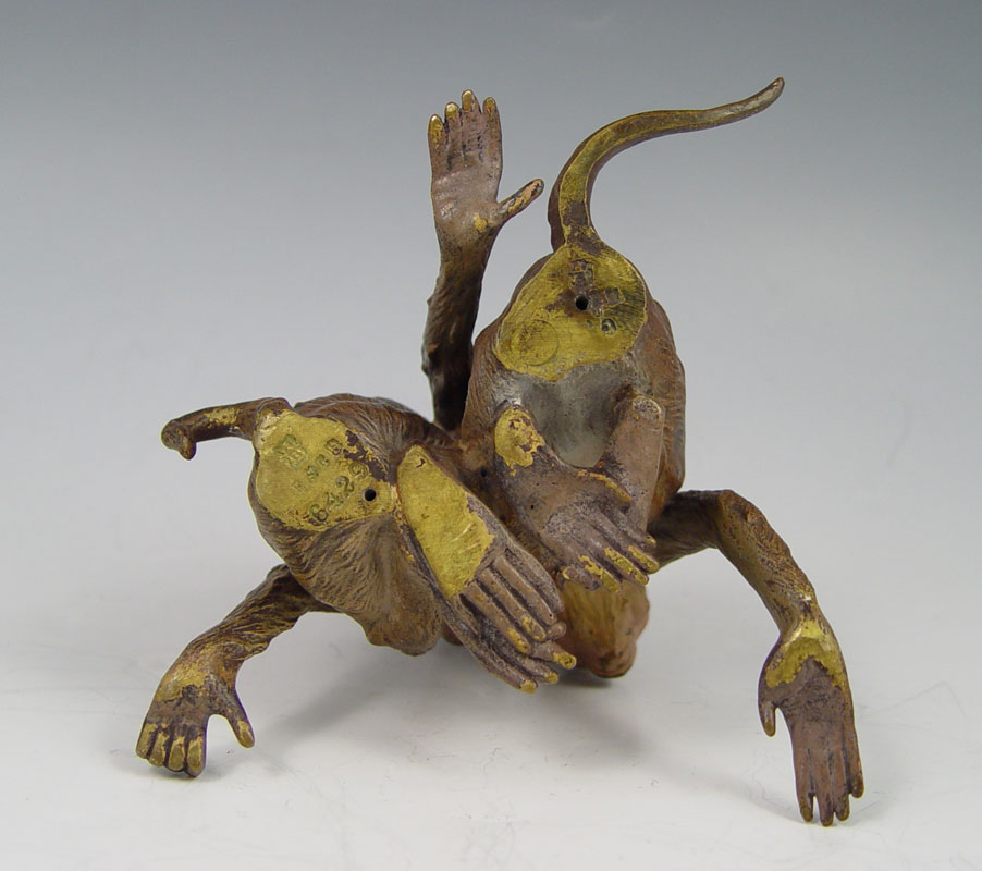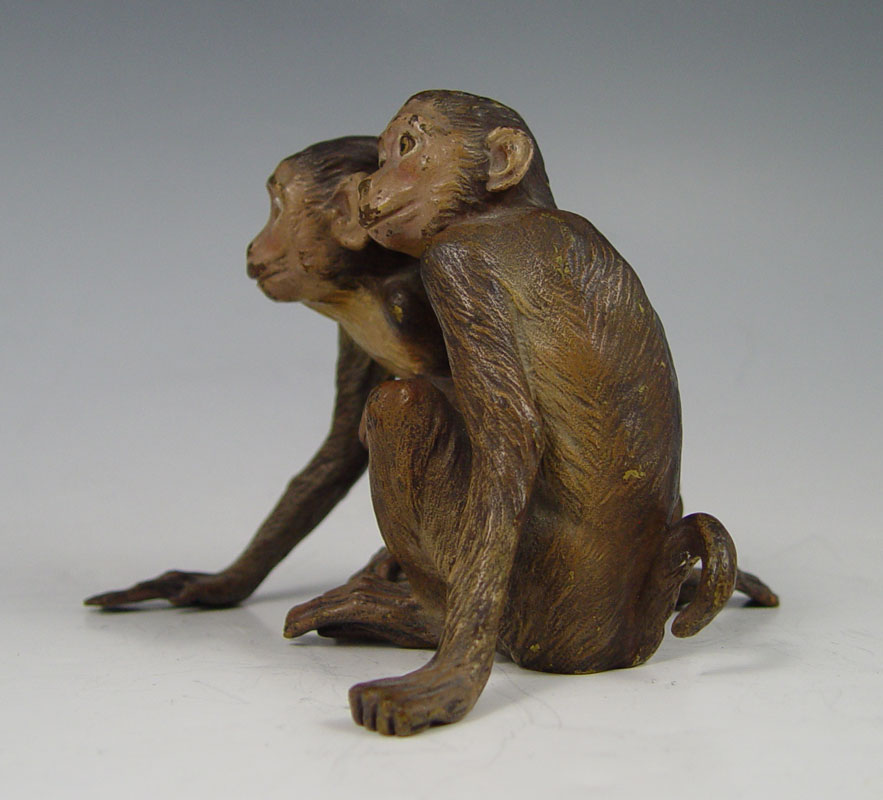 BERGMAN AUSTRIAN BRONZE MONKEYS: Franz Xavier Bergman (1861-1936). Cold painted bronze figure of two monkeys Impressed B in vase mark, 4 1/4''.