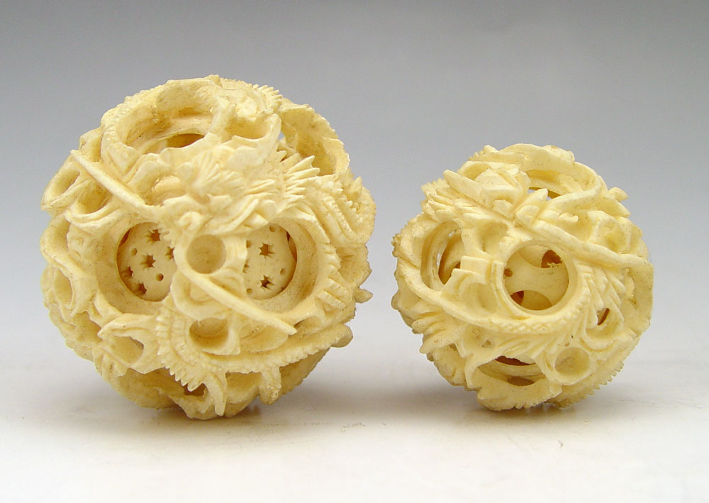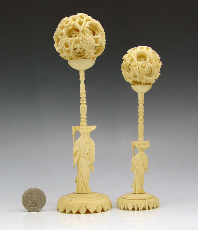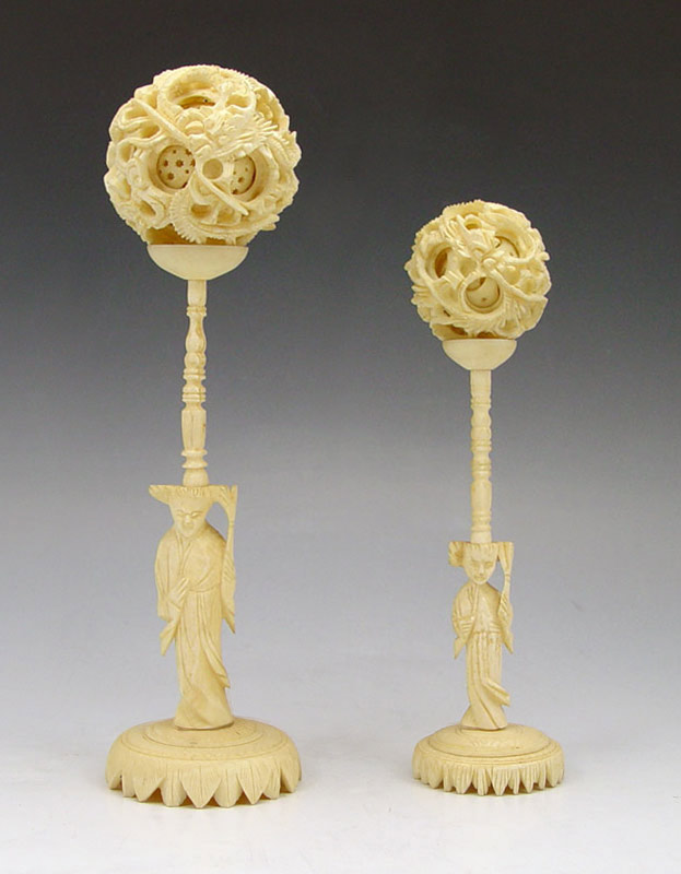 2 CARVED IVORY MYSTERY BALLS ON STANDS: Intricate mystery balls on figural stands. 6 1/2'' h. and 8'' h. overall.