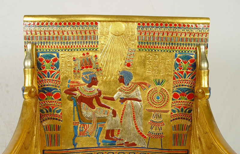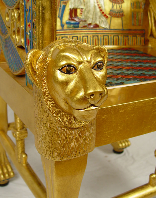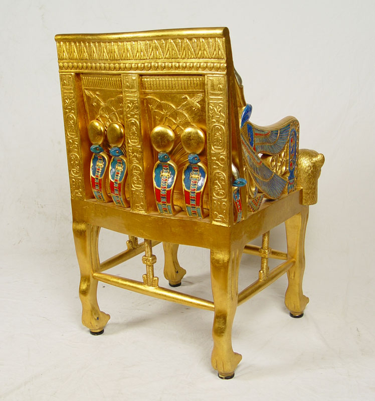 KING TUTS EGYPTIAN THRONE CHAIR, A FULL SCALE REPLICA: Showing classic painted and gold leaf figures and symbols. The weight is substantial. 41 1/2''h., 29''w. x 26''d. If a pair is your fancy, the previous lot 273 is a match. The particular chair is purportedly from the John Gotti Home on Casey Key.