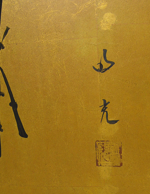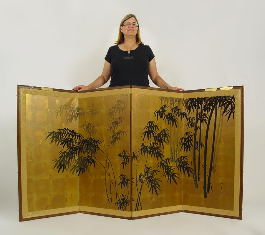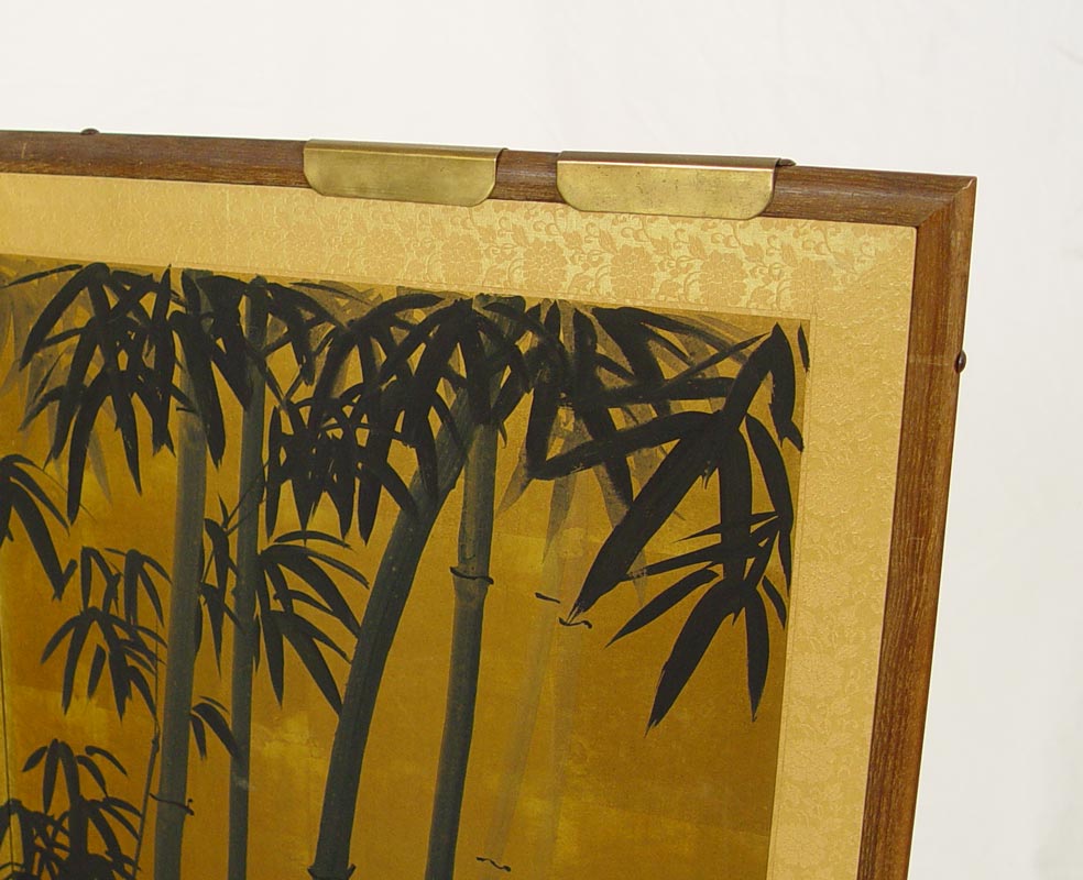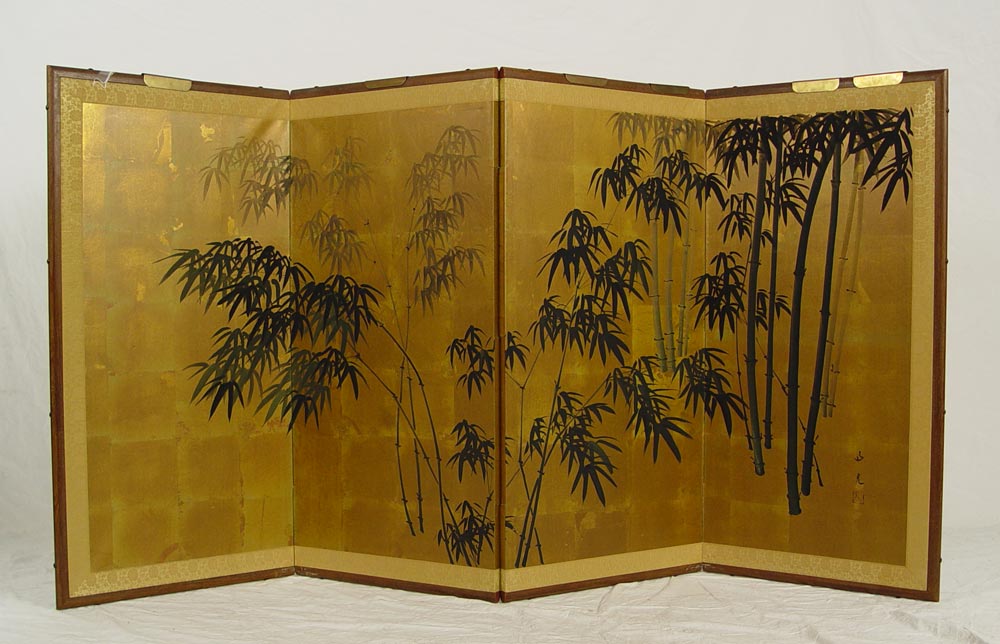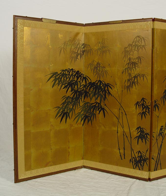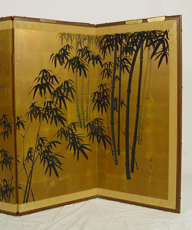 JAPANESE 4 PANEL FOLDING PAINTED SCREEN: Bamboo, Ink and mineral colors on paper, with gold leaf ground. Signed with artist's art name and artists seal following signature. Approx. 36'' tall, each panel 18'' wide.