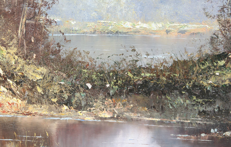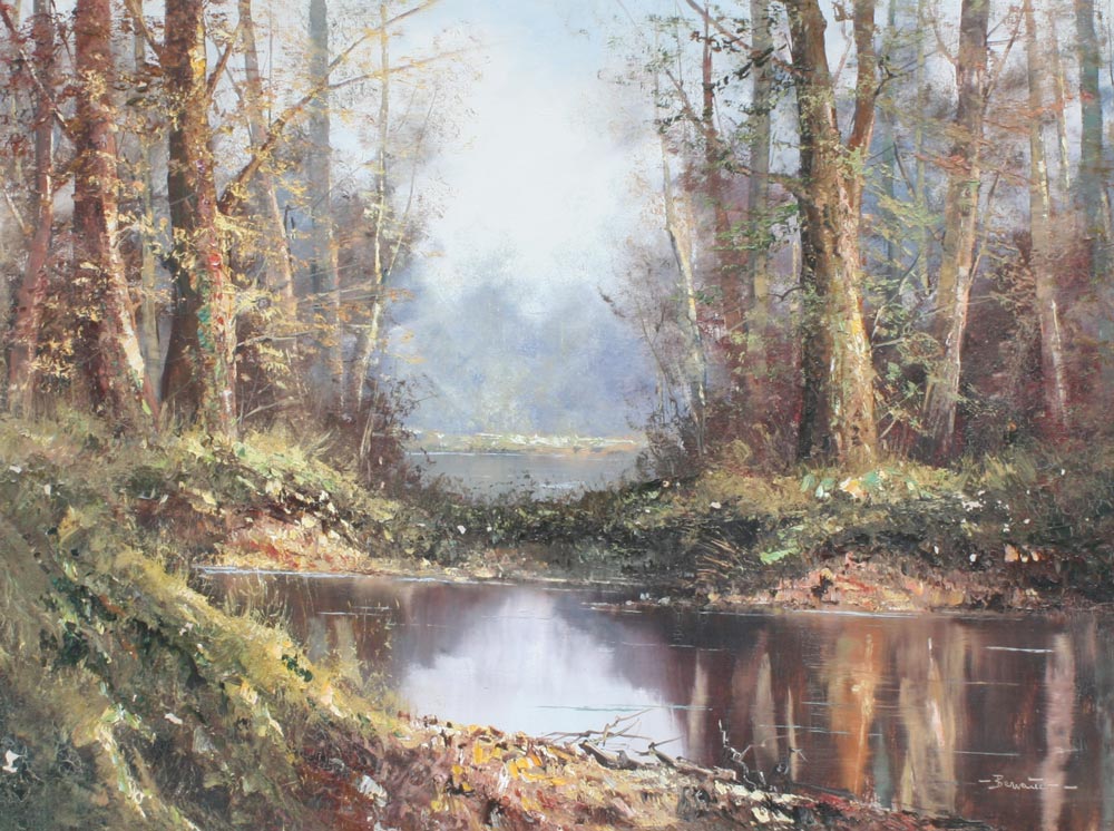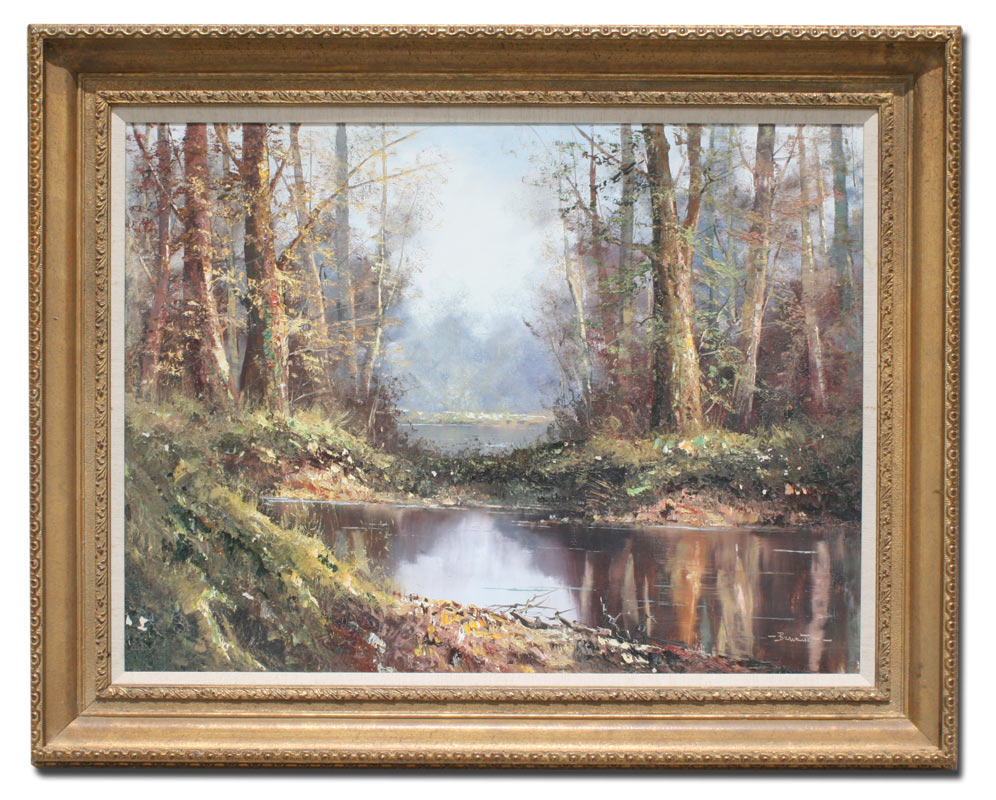 ILLEGIBLY SIGNED SERENE FOREST STREAM: Oil/Canvas, 30'' x 40'', framed, 40'' x 50''.