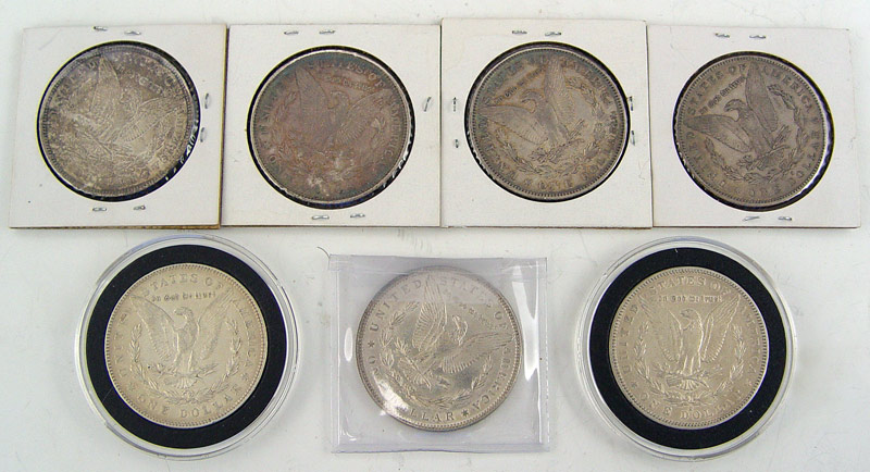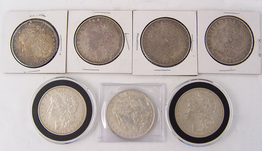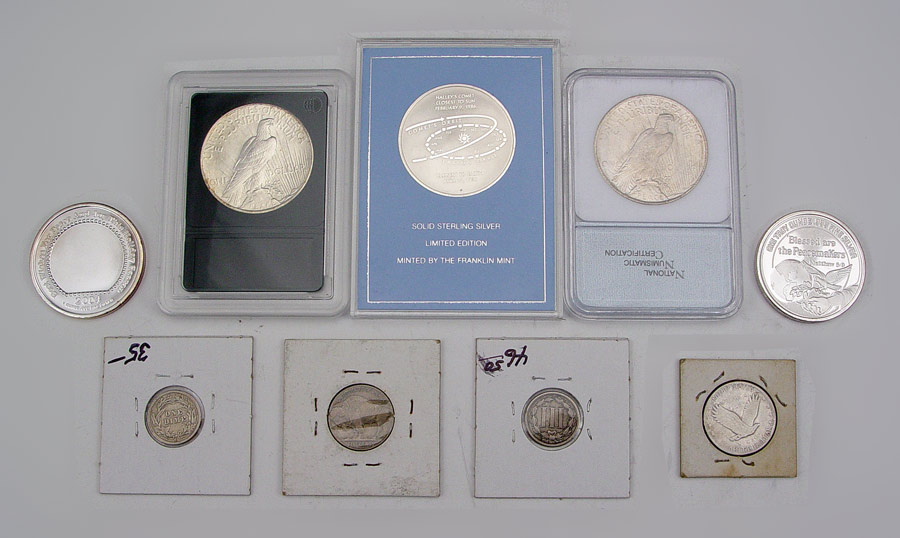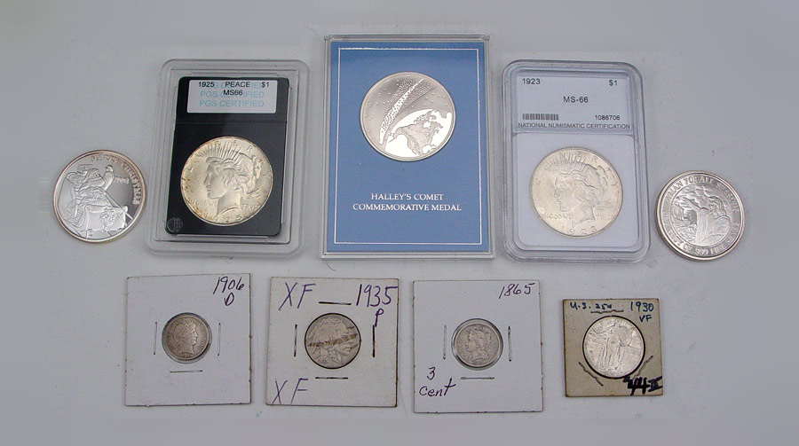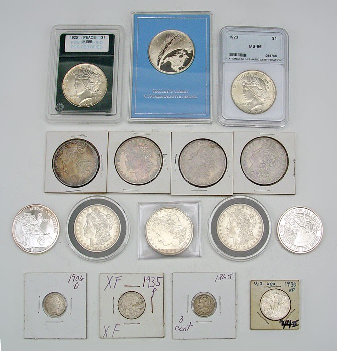 16 PIECE COLLECTION OF MORGAN SILVER DOLLARS & COINS: To include 1) 7 Morgan Dollars with dates 1878, 1883-S, 2 1885-S, 1888, 1896-O, 1896. All ungraded. 2) 2 Peace Dollars with dated 1923 NNC graded MS-66, 1925 PGS graded MS-66. 3) 1906-D Barber Dime ungraded. 4) 1865 3 cent ungraded. 5) 1935 Buffalo nickel ungraded. 5) 1930 Standing Liberty Quarter ungraded. 6) 3 collector sterling coins to include 1 troy oz. 2004 ''Merry Christmas'', 1 troy oz religious coin, Franklin Mint 7986 Haley's Comet medal.