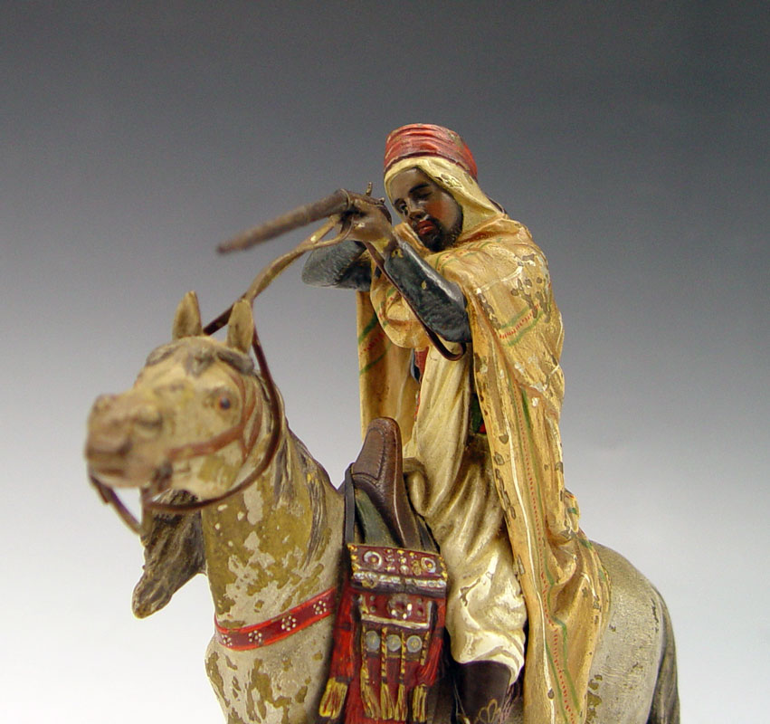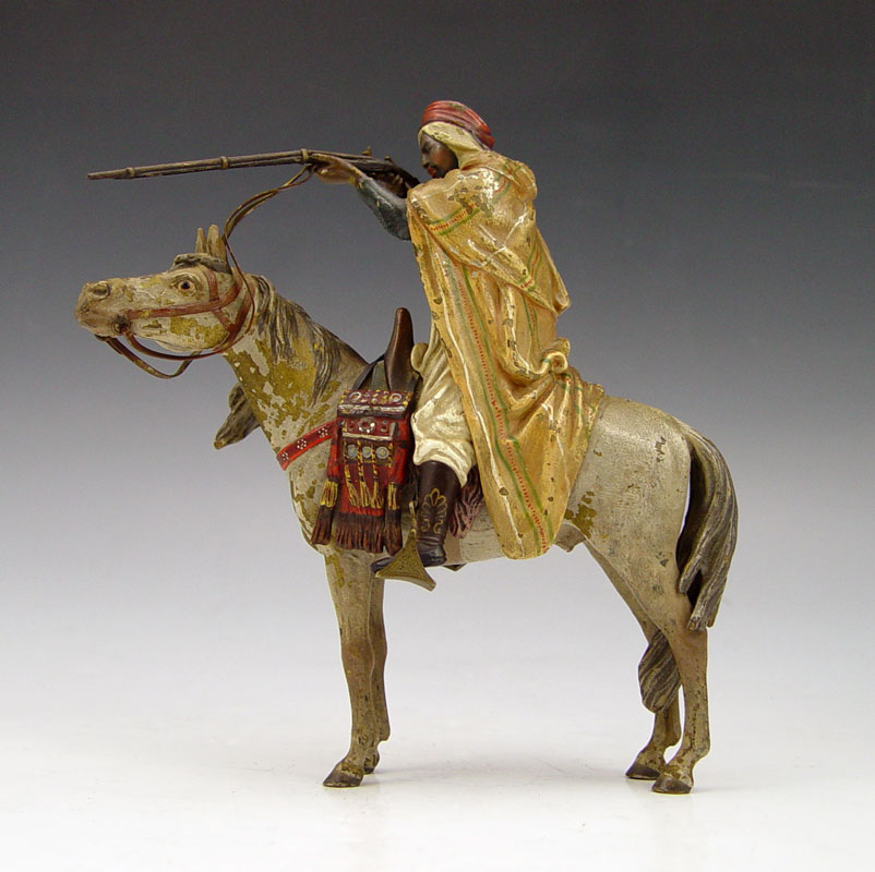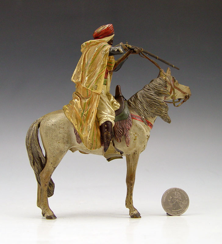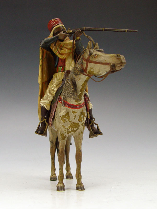 BERGMAN AUSTRIAN BRONZE ORIENTALIST FIGURE: Franz Xavier Bergman (1861-1936). Cold painted bronze figure of man with a rifle mounted on a horse. Impressed B in vase mark, 6 1/2''h. x 6 1/4'' l.