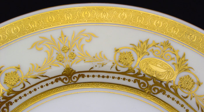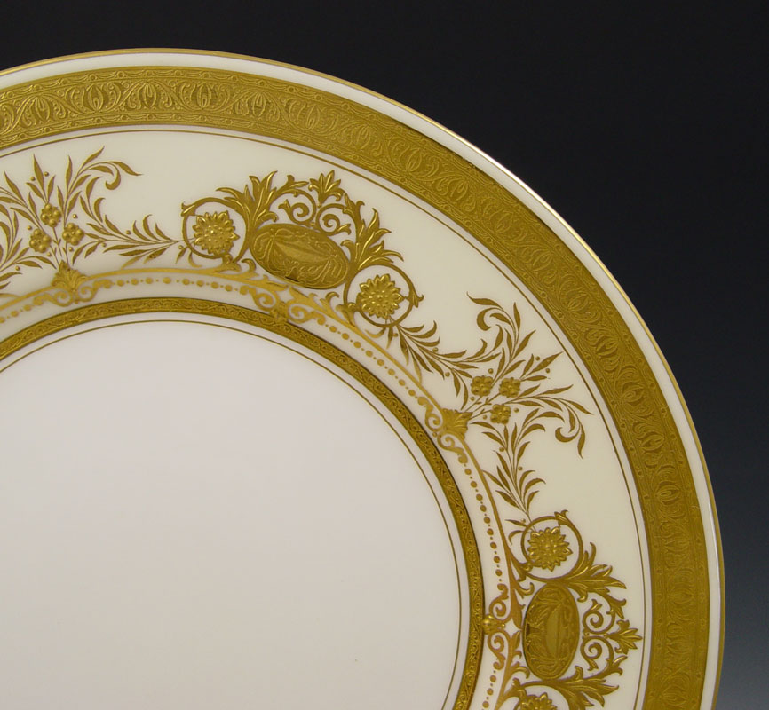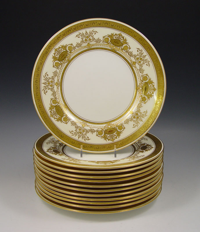 12 MINTON SERVICE PLATES: Rich with gilding. Retailed by Davis Collamore & Co. 10 1/2'' dia.