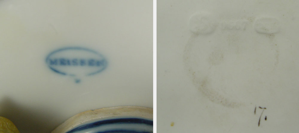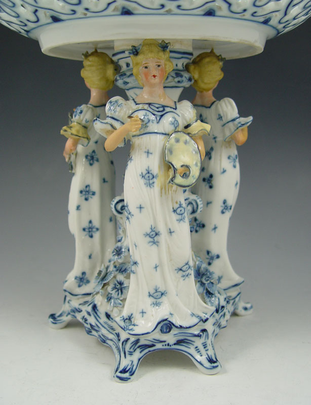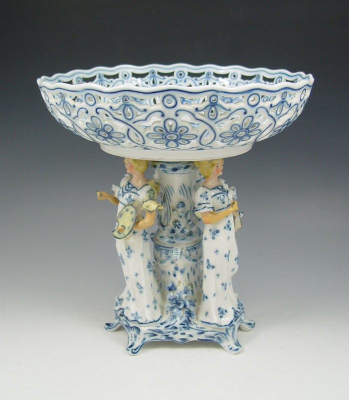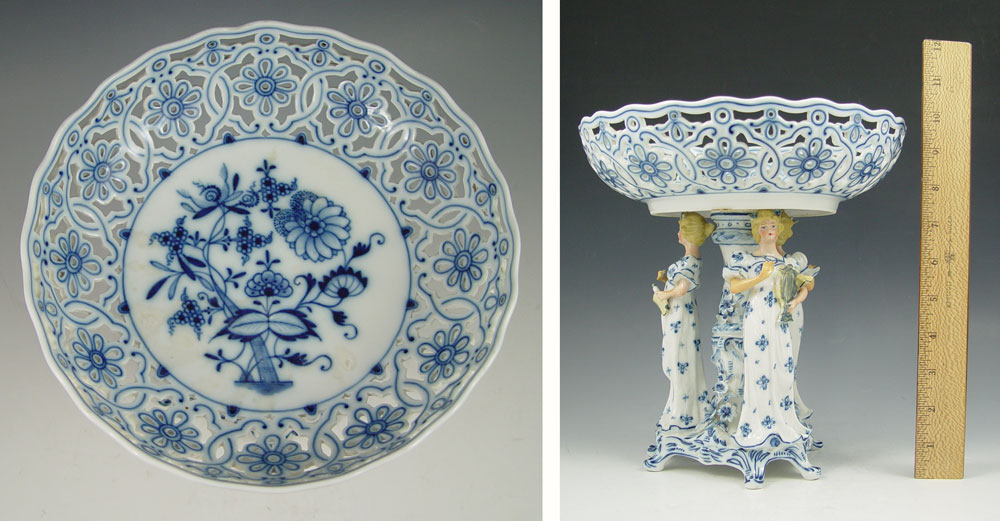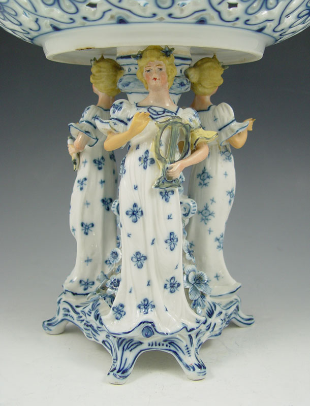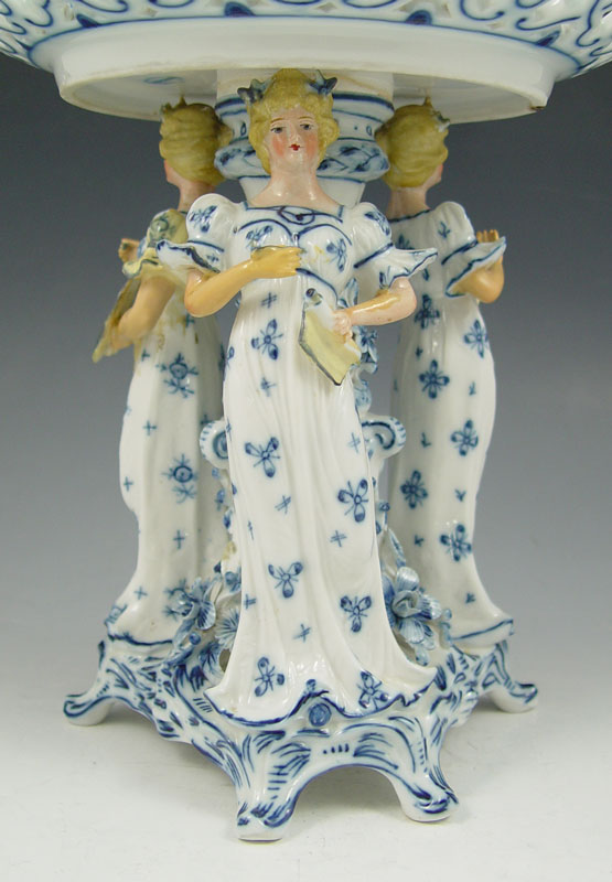 C. TEICHERT MEISSEN FIGURAL COMPOTE: Ca. 1882-1930. Three figures supporting the reticulated Blue Onion bowl. 10 1/2'' x 9 1/2'' dia.