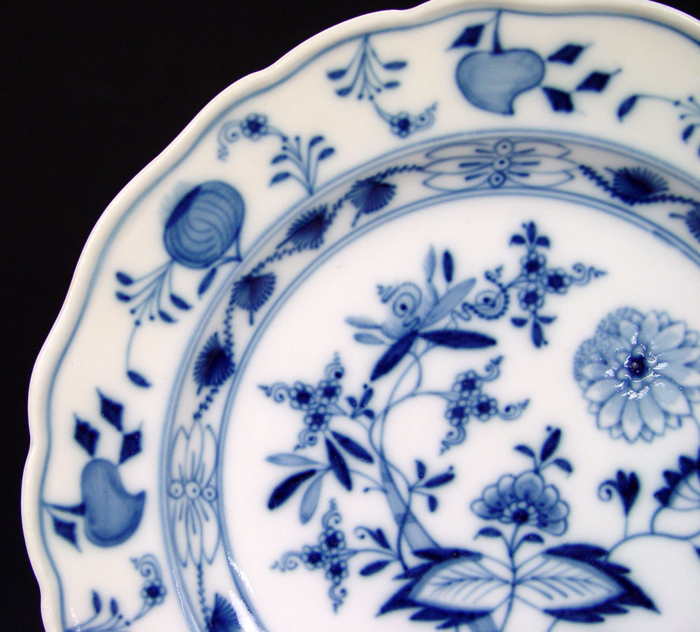 MEISSEN BLUE ONION AND FULL GREEN: 7 piece group to include 4 Meissen Blue Onion plates, 9'' dia. A Full Green gravy boat, 9'' long x 6'' tall. Also in the Blue Onion pattern a wood handle star shaped porcelain chocolate stirrer and a porcelain rolling pin with wood handles.