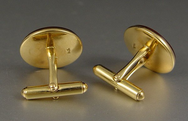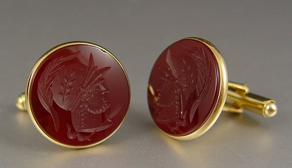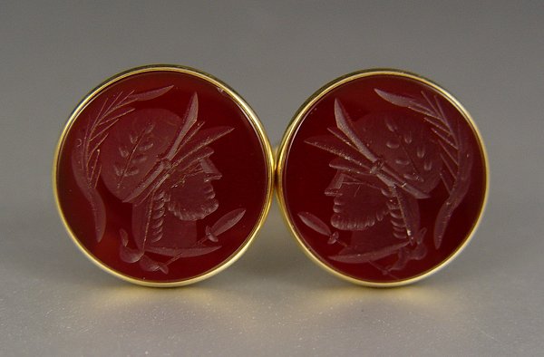 14K GOLD CARNELIAN INTAGLIO CUFF LINKS: 14K yellow gold cufflinks contain two round shaped intaglios depicting Trojan warriors. The intaglios measure approx. 2.00 mm. Toggle closures. Weight: 12.2 grams.