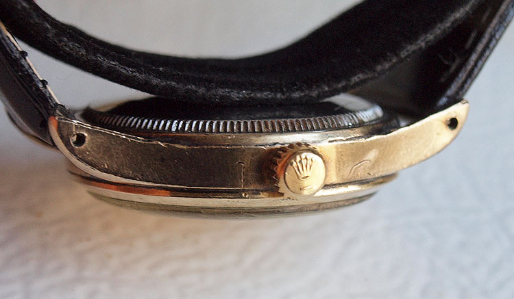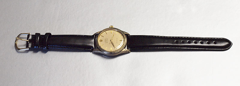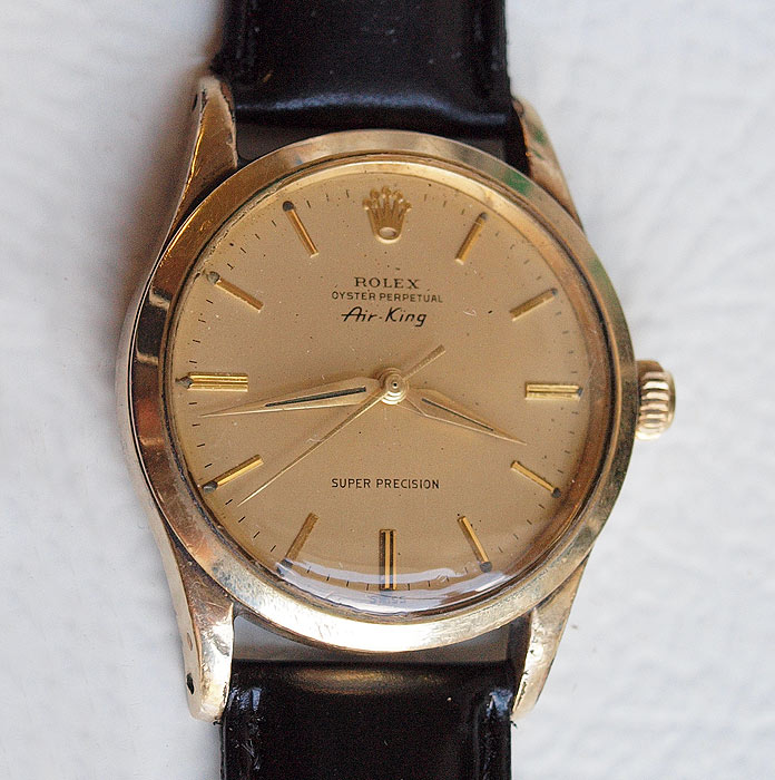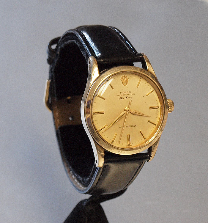 GENTS 1948 ROLEX AIR KING WRIST WATCH: Ref 5506, Super precision, gold capped or clad (40 micros thick) over steel, Oyster style with engine turned bezel, movement is caliber 1530 with 25 jewel, automatic winding function seems to be working fine, original champagne colored dial with gold stick markers showing correct ageing for this model, Dauphine hands with black centers and second sweep, Rolex screw down winding crown seems to be fine, Serial # 546xxx, all markings inside and K.B. & 40 marks outside are original to the watch and are correct for this model, stainless steel back, 73543 inside movement ring. New black leather band.