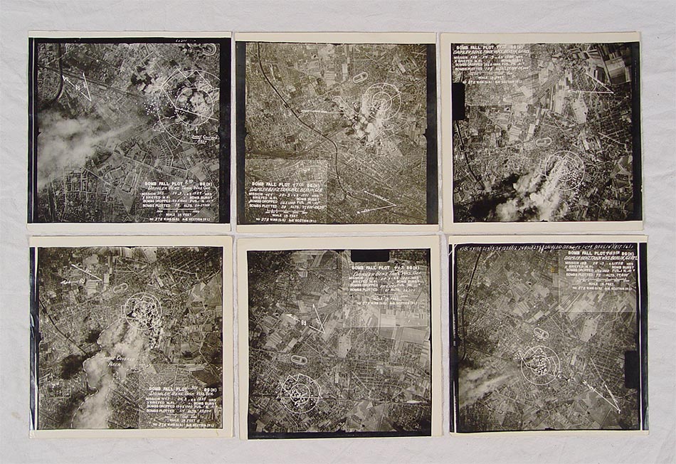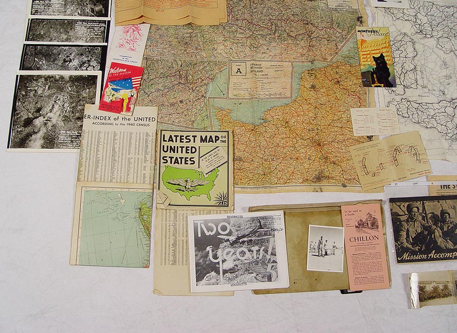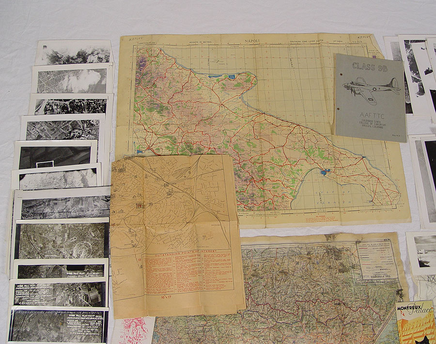 COLLECTION OF WWII BOMBER PHOTO'S & MEMORABILIA: Collection of Corporal Ben Graber to include bombing surveillance photos including targets in Italy, Greece, Austria, Daimler Benz Tank Werks Berlin and unidentified targets. Silk pilots maps of Northern & Southern Italy; France, Belgium Holland and Spain on second silk map. Air Force Commendation Medal (missing bars). Also included is assorted collection of Stars & Stripes newspapers, booklets, wires from home, postcards and clippings.