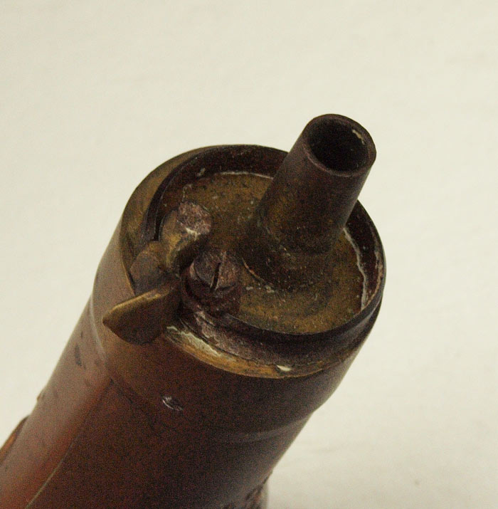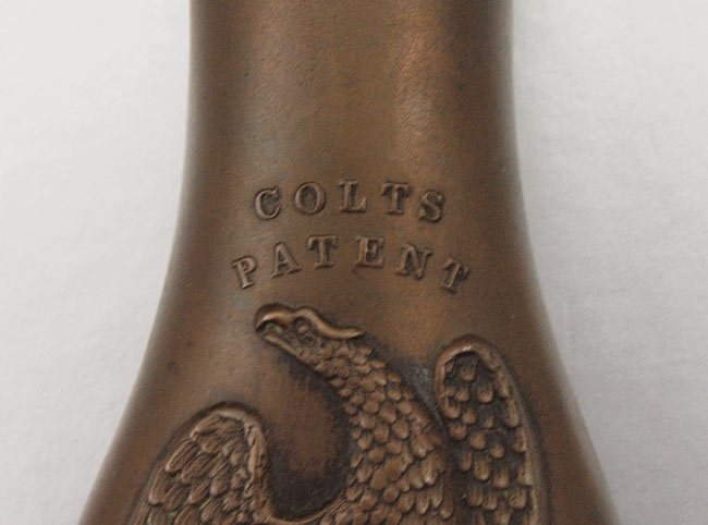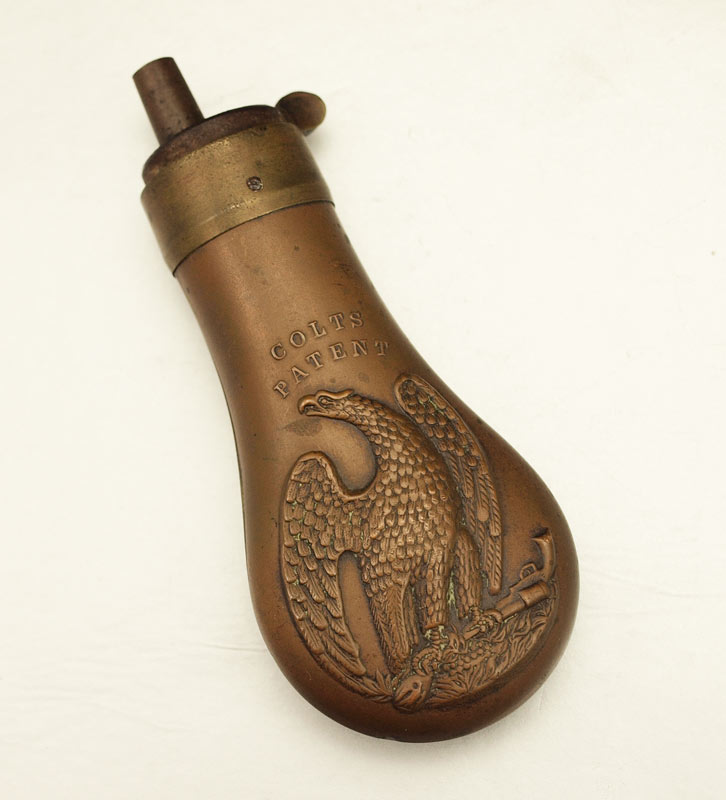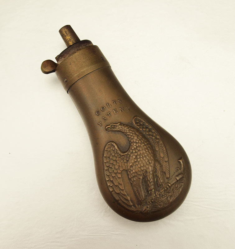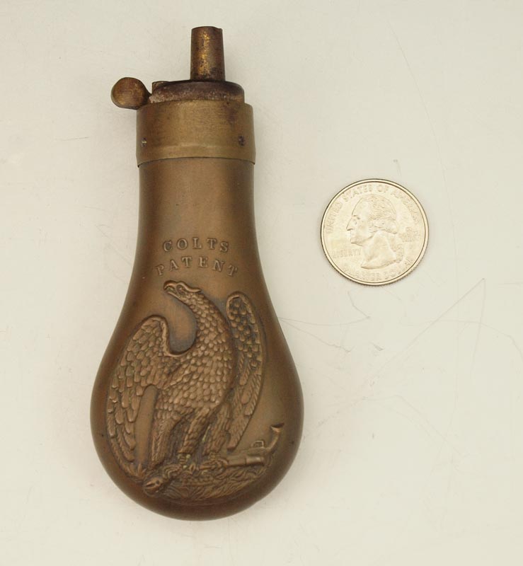 1849 COLT POCKET EAGLE BRASS POWDER FLASK: Small flask with eagle clutching revolver on ground with ''Colt's Patent''. Most likely paired with the 1849 Colt Pocket pistol. Spring works. 4 1/8'' x 1 7/8''.