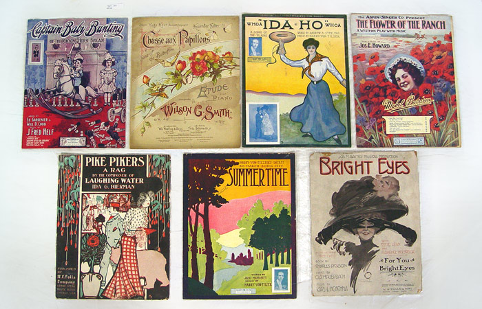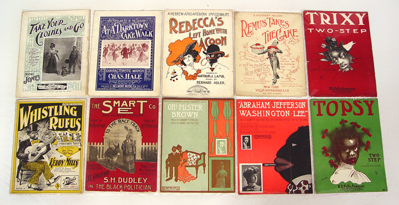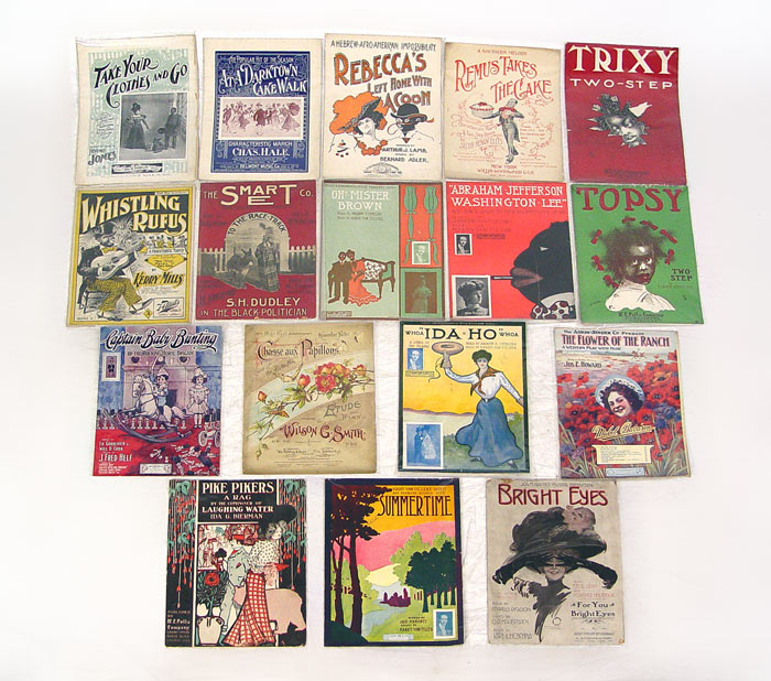 COLLECTION OF AFRICAN AMERICAN LARGE FOLIO SHEET MUSIC: 17 pieces to include African American & more sheet music. Titles include ''Rebecca's Left Home With a Coon'', ''Remus Takes The Cake'', ''Oh! Mister Brown'', ''At A Darktown Cakewalk'', ''Take Your Clothes & Go'', ''Abraham, Jefferson, Washington, Lee, You Ain't Going to Pick No Fuss Out of Me'', ''Whistling Rufus'', ''To the Race-Track'', ''Trixie Two-Step'', ''Topsy Two-Step'', ''Chase of The Butterflies'', ''Whoa Ida Ho Whoa'', ''Captain Baby Bunting of The Rocking Horse Brigade'', ''Pike Pickers Rag'', ''Summertime'', ''Bright Eyes'', ''Flowers of the Ranch''. Each folio 14'' x 10 3/4''