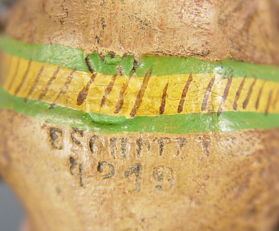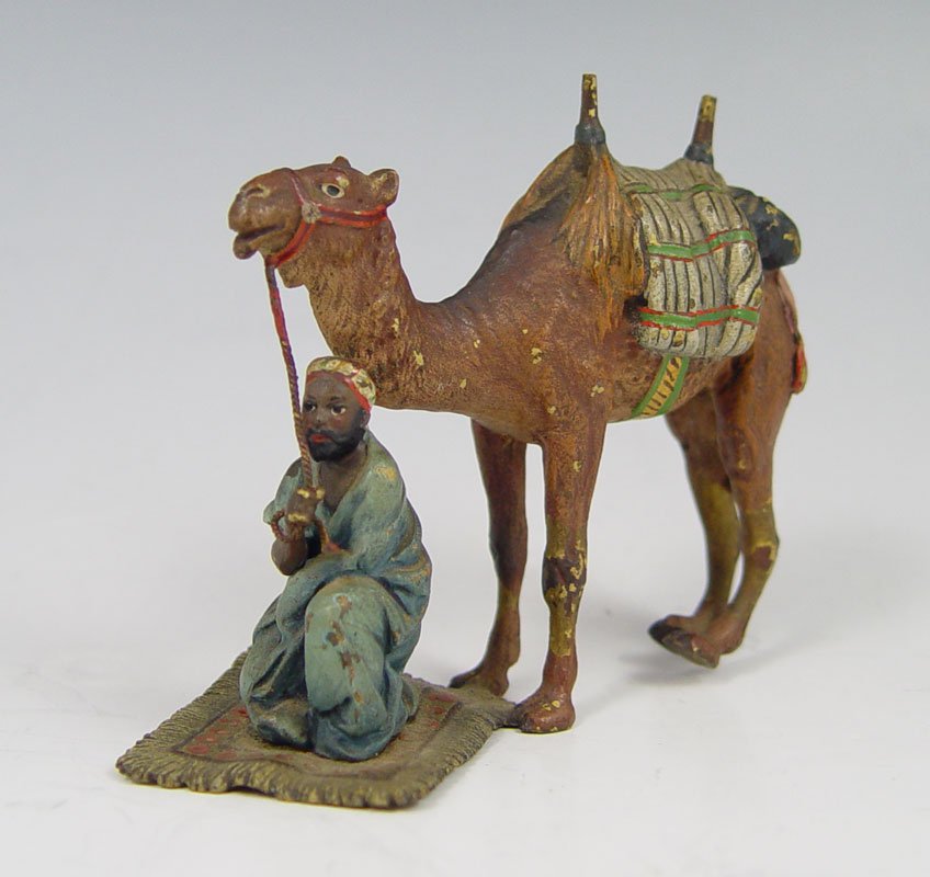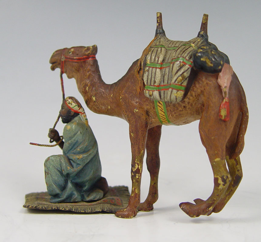 BERGMAN AUSTRIAN BRONZE ORIENTALIST FIGURE MAN WITH CAMEL: Franz Xavier Bergman (1861-1936). Cold painted bronze figure of a squatting man with his camel. Impressed B in vase mark, 2 1/4''.