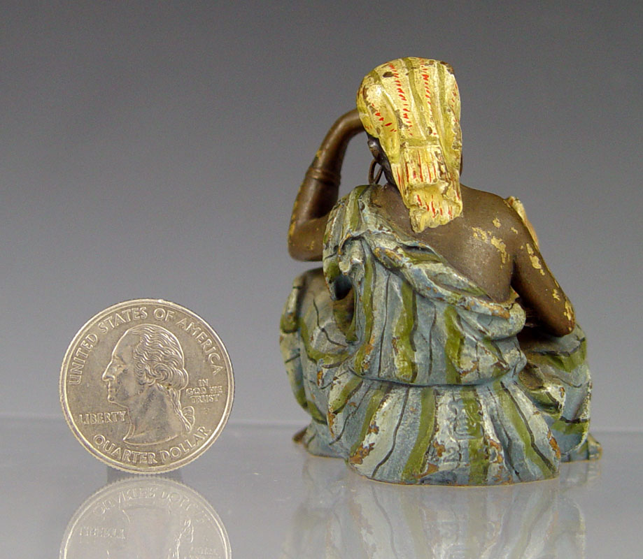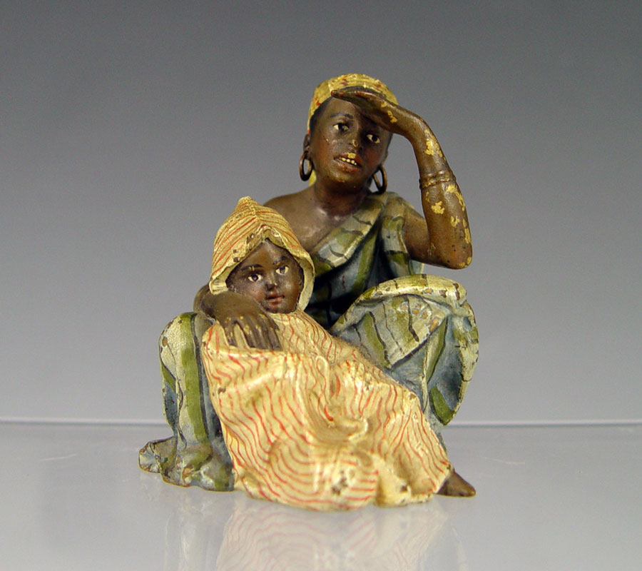 BERGMAN AUSTRIAN BRONZE ORIENTALIST FIGURE WOMAN AND CHILD: Franz Xavier Bergman (1861-1936). Cold painted bronze figure of a seated woman with a child. Impressed B in vase mark, 3'' tall x 3 1/2''l