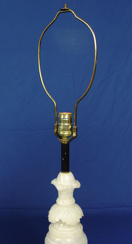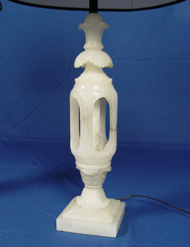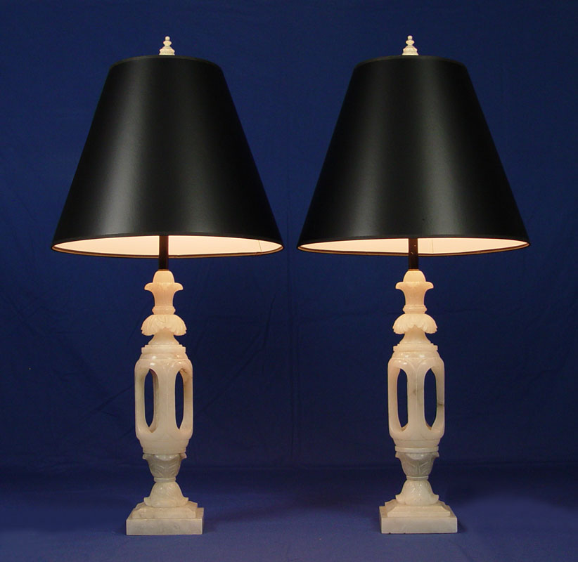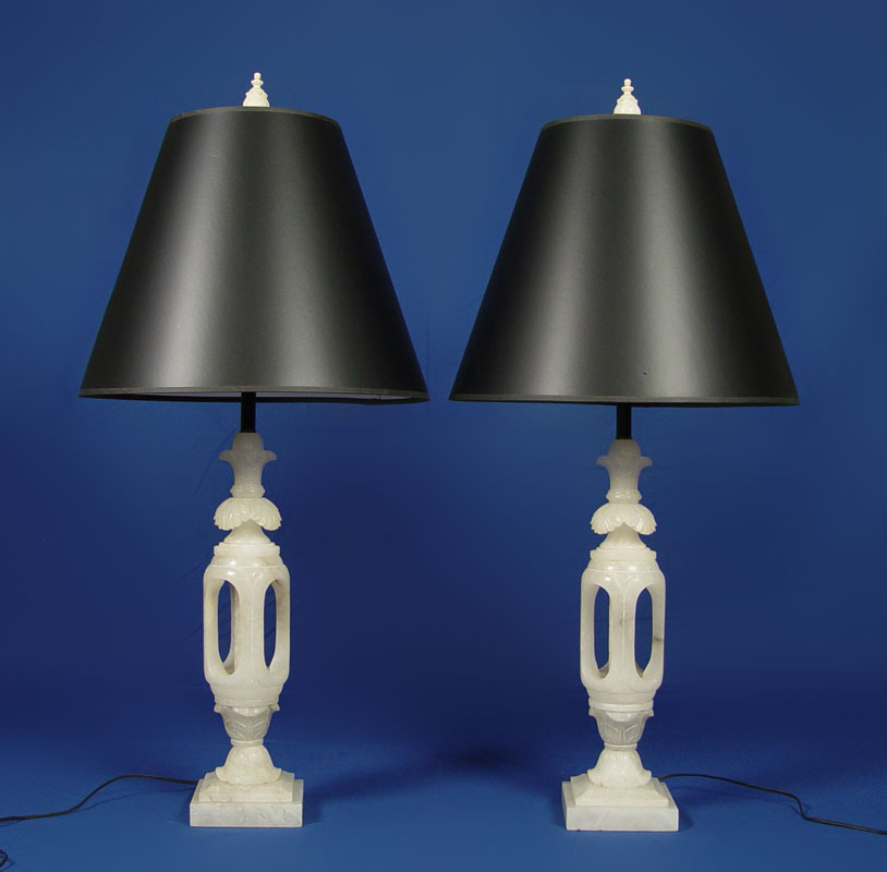 PAIR CARVED ALABASTER LAMPS: Lamps are approx. 35''h. alabaster alone is 20'' tall. Sold with the black paper shades.