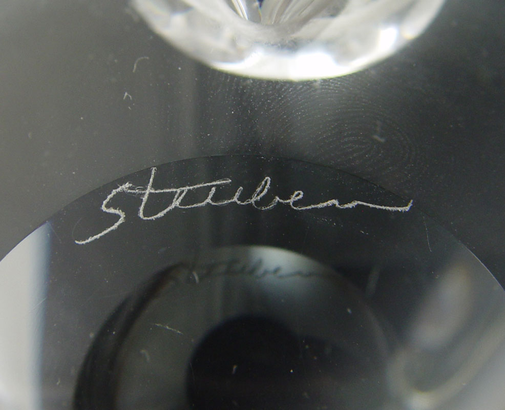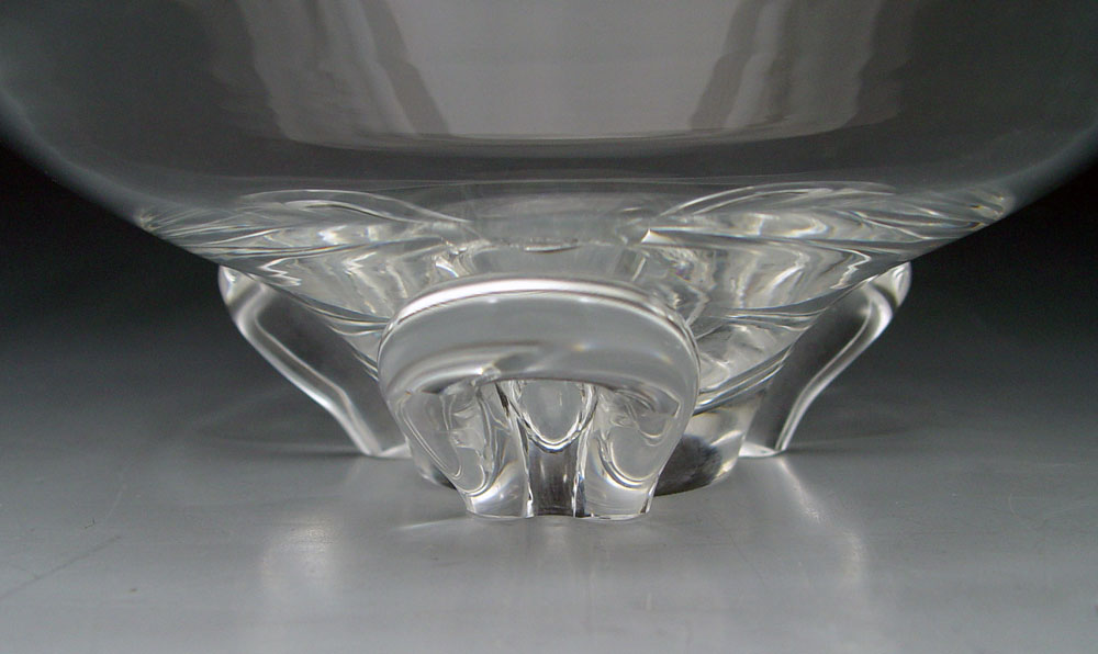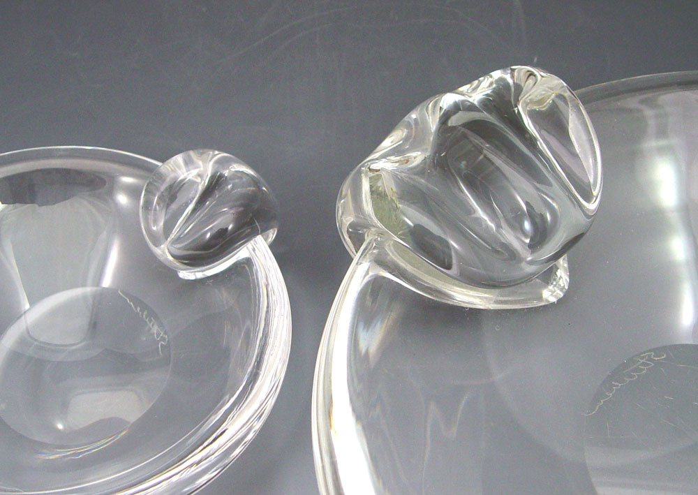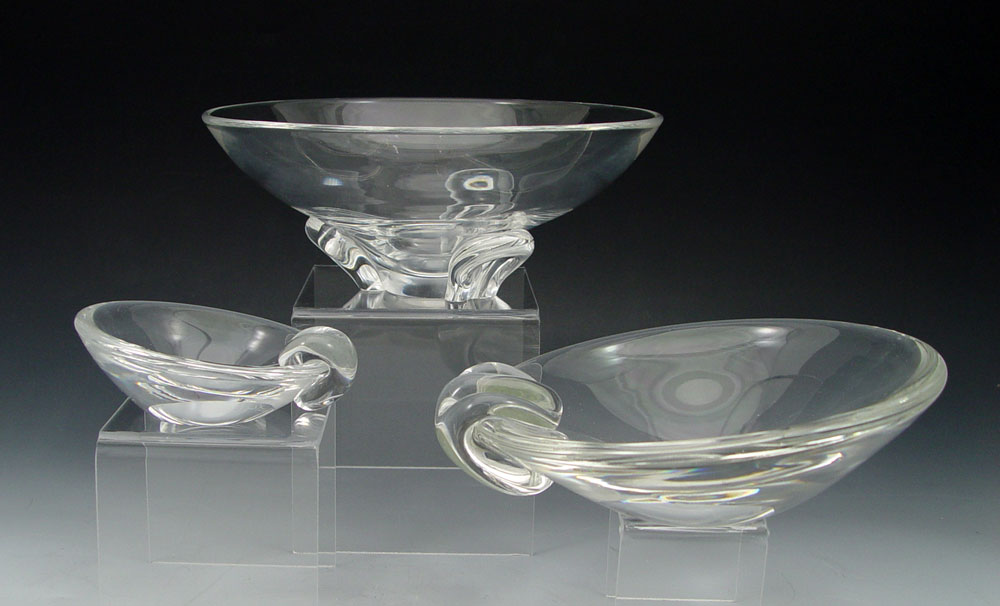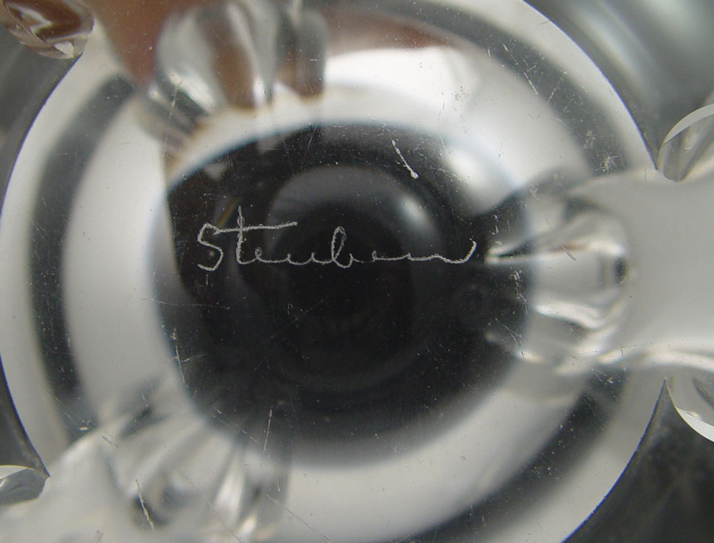 3 PIECE STEUBEN CRYSTAL BOWLS: To include 1) Centerbowl, signed. 3'' h. x 7 3/4''. 2) Ashtray, signed. 2 1/4'' x 7'' dia. 3) Ashtray, signed. 1 3/8'' x 4''.