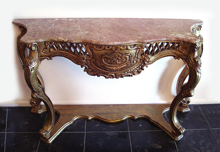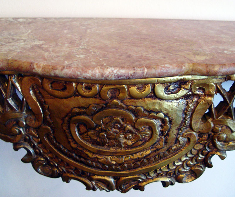 GILT ITALIAN STYLE MARBLE TOP CONSOLE TABLE: Late 20th C. Rose marble top over carved wood, cross cut apron, lower shelf. 28 3/8'' h. x 46 3/4'' x 15''