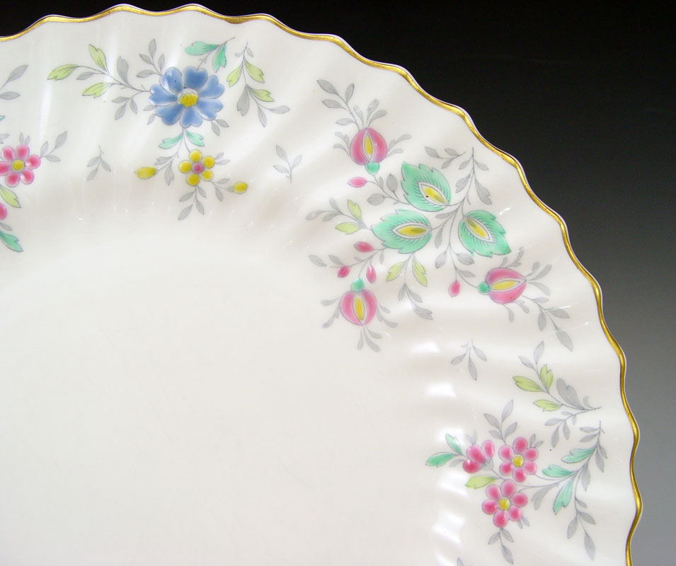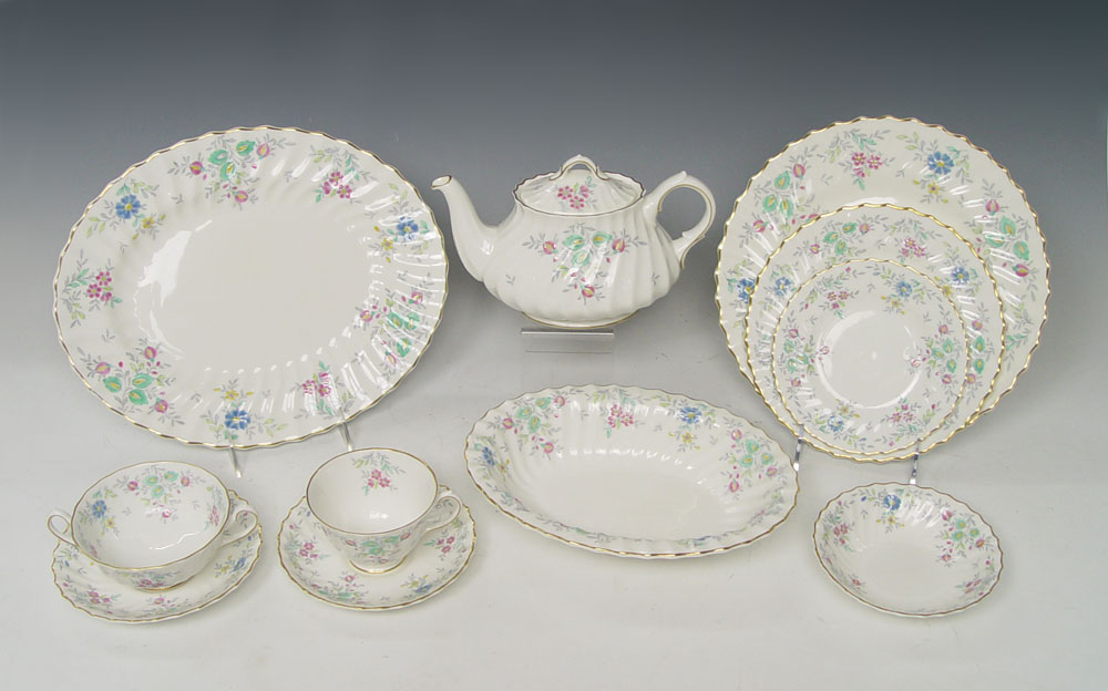 ROYAL DOULTON BONE CHINA SERVICE IN THE PASTORAL PATTERN: 99 pieces to include 13 dinner plates, 13 salad plates, 13 bread plates, 8 cream soups with 8 underplates, 12 fruit bowls, 16 cups and 13 saucers. Serving pieces are the oval vegetable, small platter, and teapot.