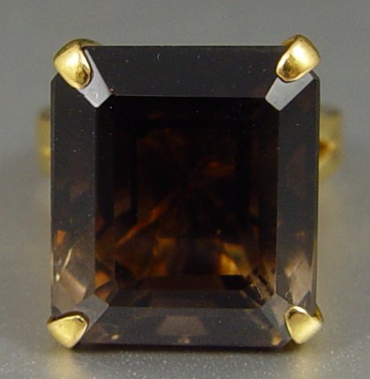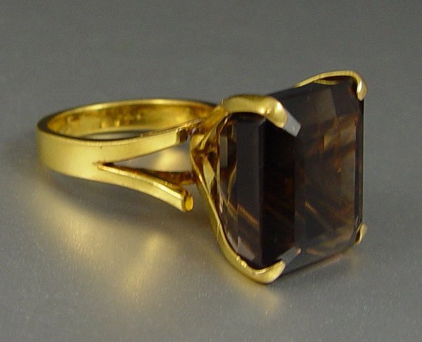12.7 CT SMOKY QUARTZ RING: 18K yellow gold ring contains one emerald cut smoky quartz. Weight: 21.50 Ct. Approx. The quartz is prong set. Weight: 12.7 grams. Size: 6.5