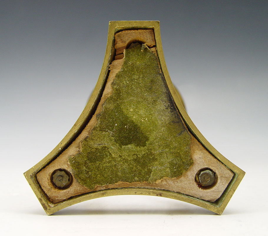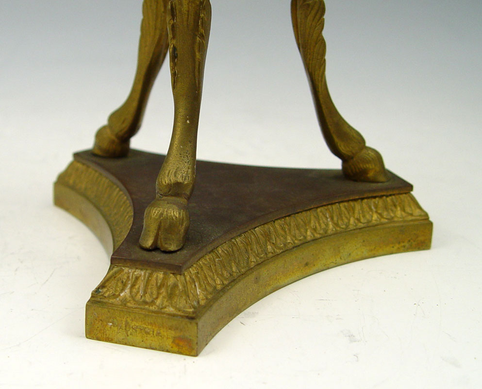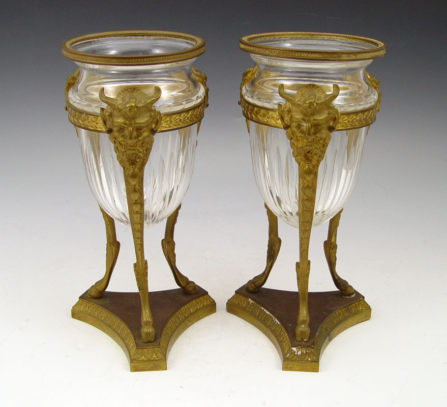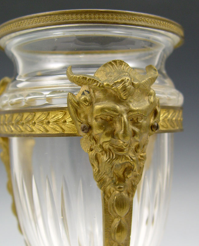 AUSTRIAN BRASS MOUNTED SATYR MASQUERON URNS: Glass vases fitted into masqueron stand. 8 1/2'' tall.