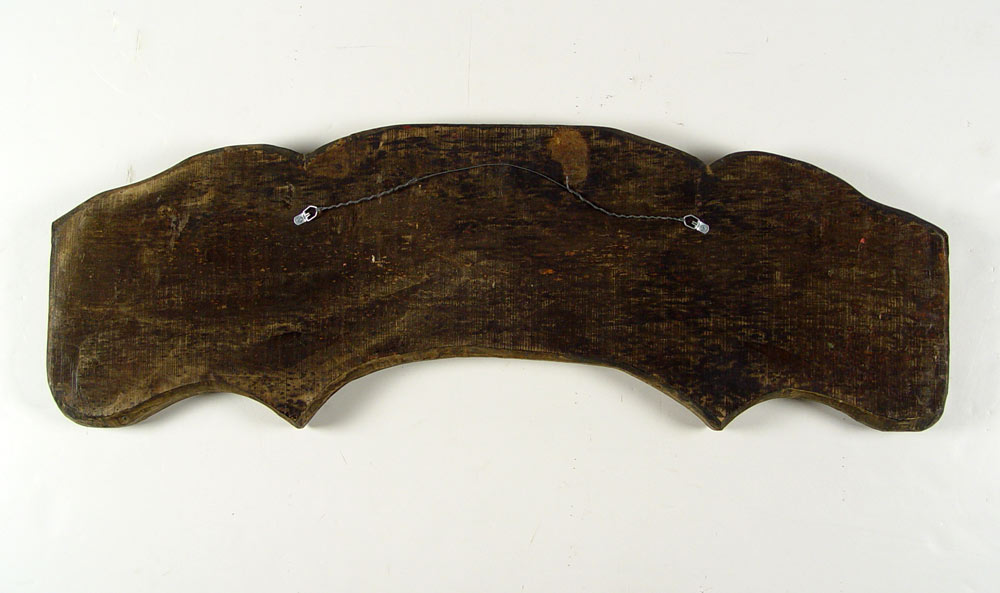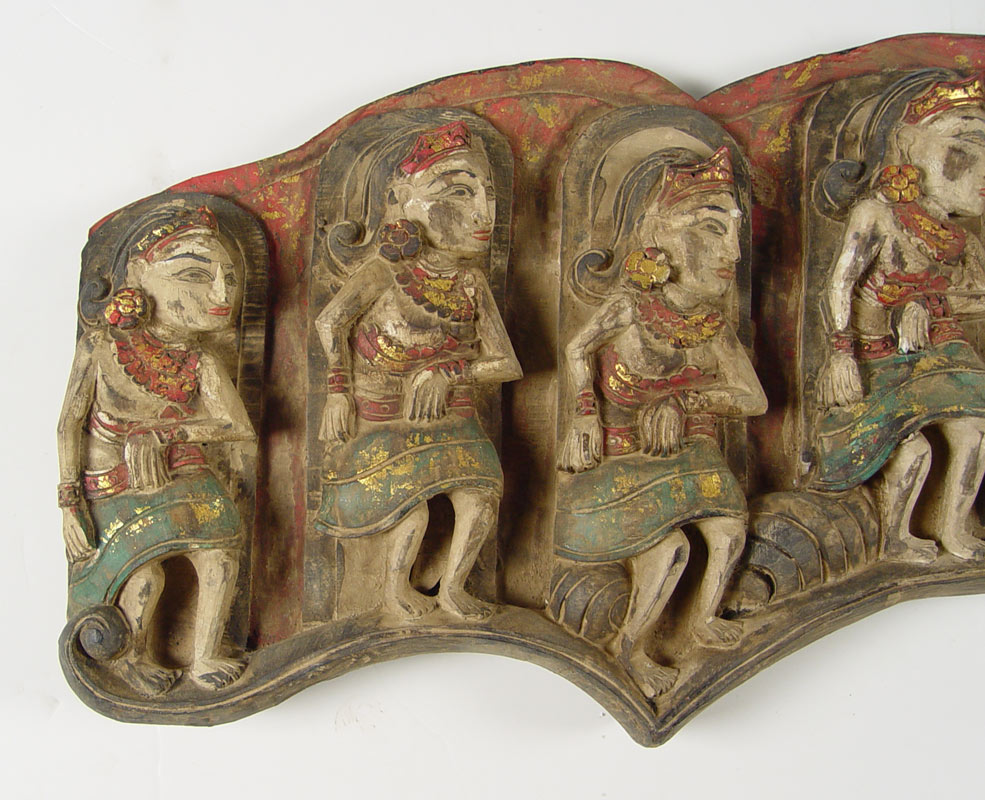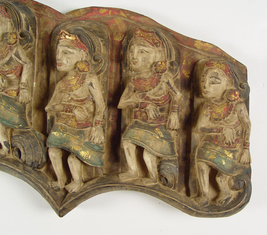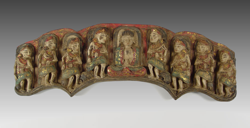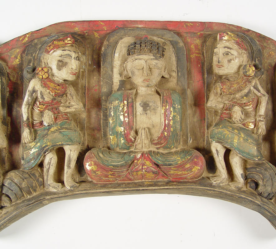 CARVED BUDDHA INDONESIAN DOOR LINTEL: Four figures flank Buddha. Remains of paint and gold leaf. Approx. 40'' x 11''.