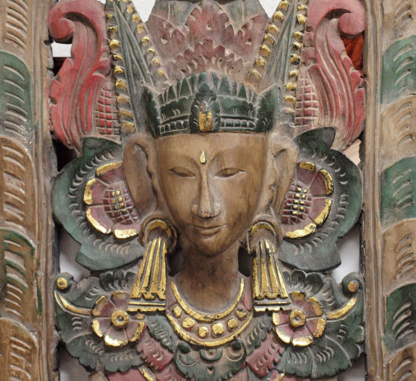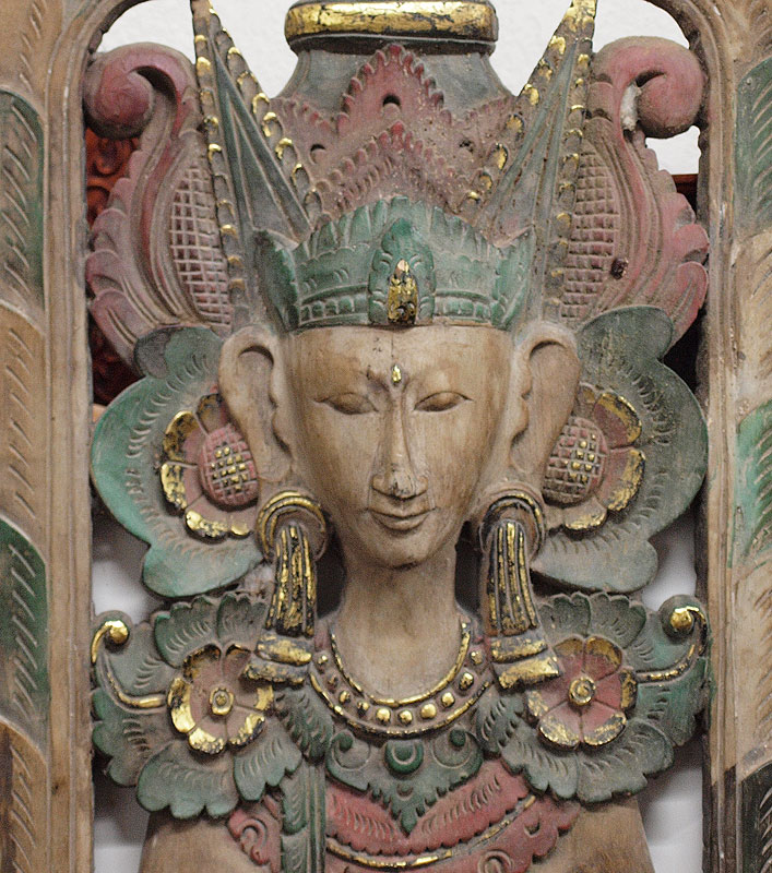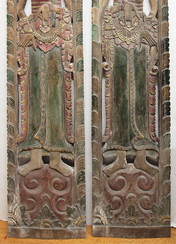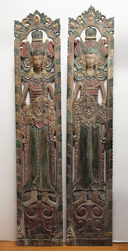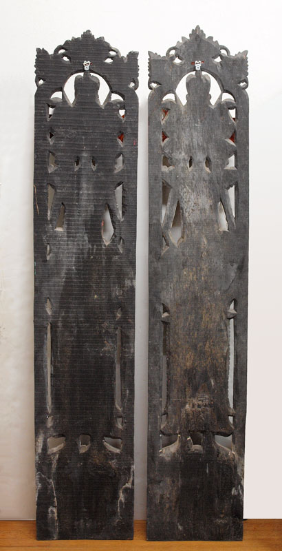 OVER 7 FT TALL INDONESIAN CARVED PANELS: Pair of panels, pigment stained and gold leaf. Approx. 77'''' x 15''.
