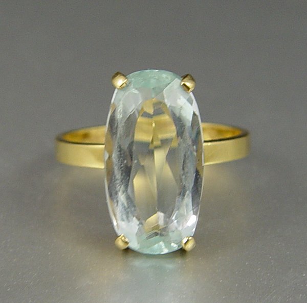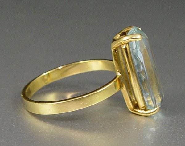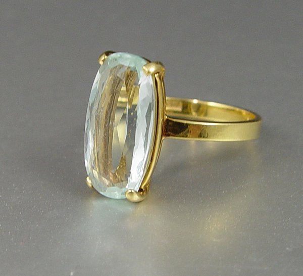 7.5 CT AQUAMARINE RING: 18K yellow gold ring contains one oval mixed cut aquamarine. Weight: 7.50 Ct. Approx. The aquamarine is prong set. Weight: 3.6 grams. Size: 6.5
